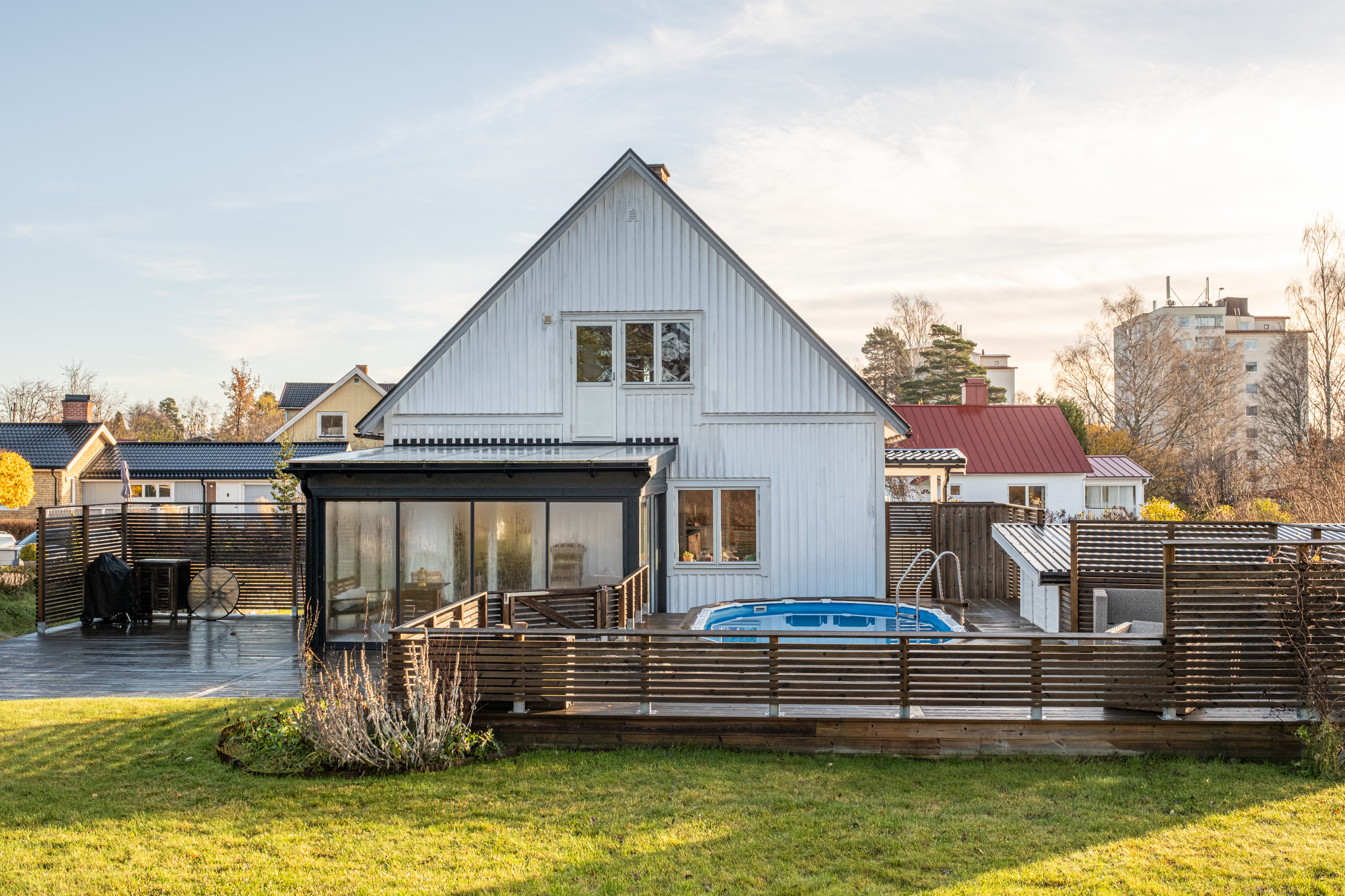 Den insynsskyddade tomten är som en egen oas med fina uteytor, en pool med stabil vintertäckning, ett rymligt verandadäck och det inglasade uterummet som tillsammans ger plats för många fina sommardagar. Baksidan vetter mot Rummelkullens stora allmänning vilket ger en naturnära känsla av lugn och avskildhet.