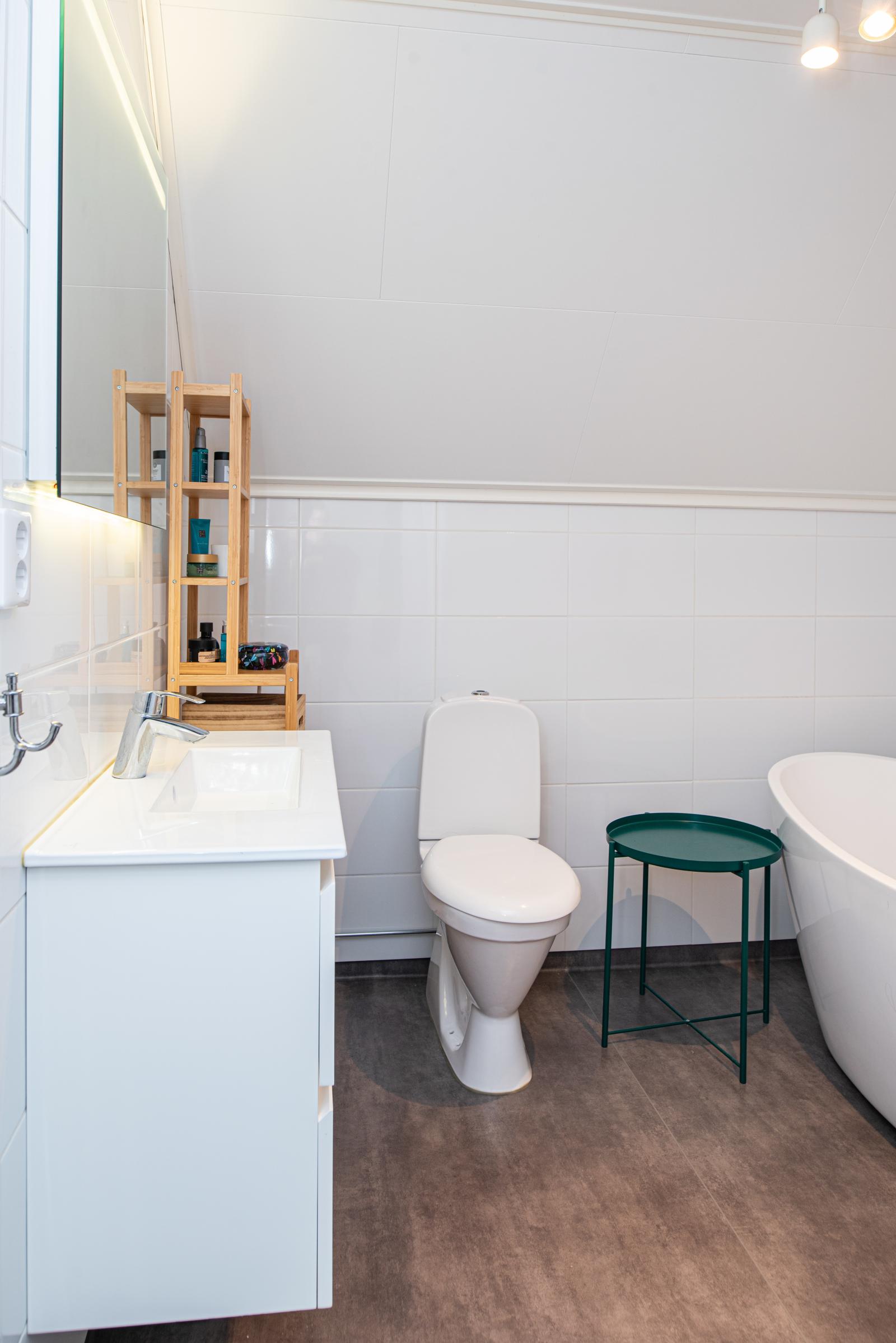Här finns tre sovrum. Det största har garderober längs ena väggen och altandörr som ger möjlighet att bygga balkong ovanför uterummet. Badrummet är rymligt och utrustat med badkar, kommod och spegelskåp. De två mindre sovrummen passar perfekt som barnrum, gästrum eller hemmakontor.