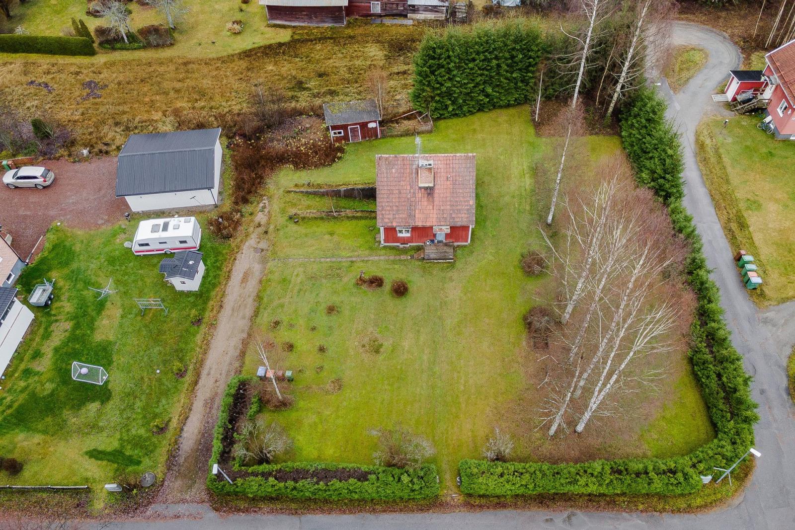 Utomhus väntar en trivsam och lättskött tomt med gott om utrymme för både lek, odling och avkoppling. Här kan du skapa din egen oas – kanske en blomstrande trädgård, en mysig uteplats eller plats för barnens sommarlek.