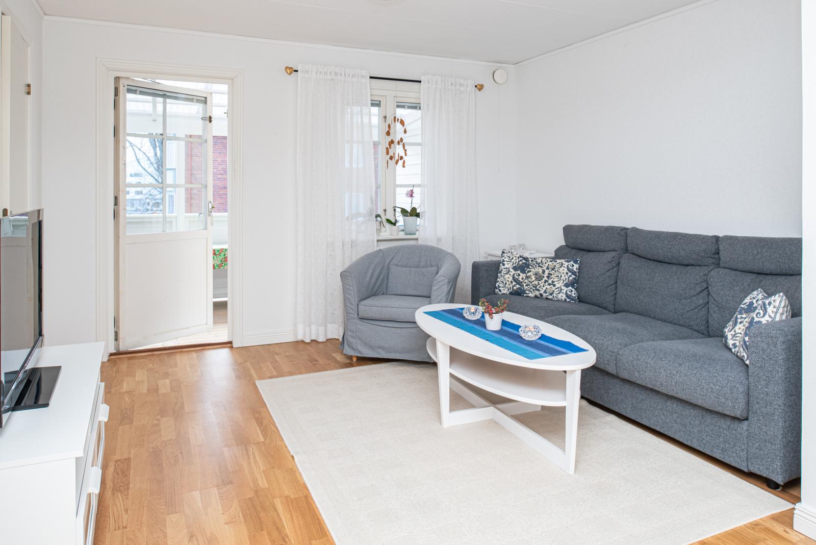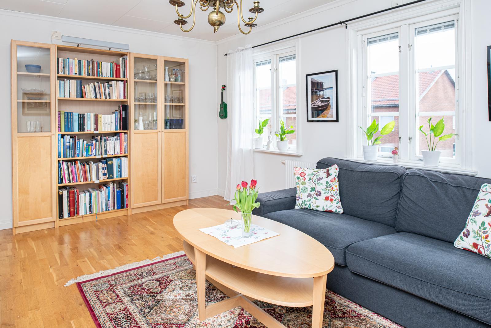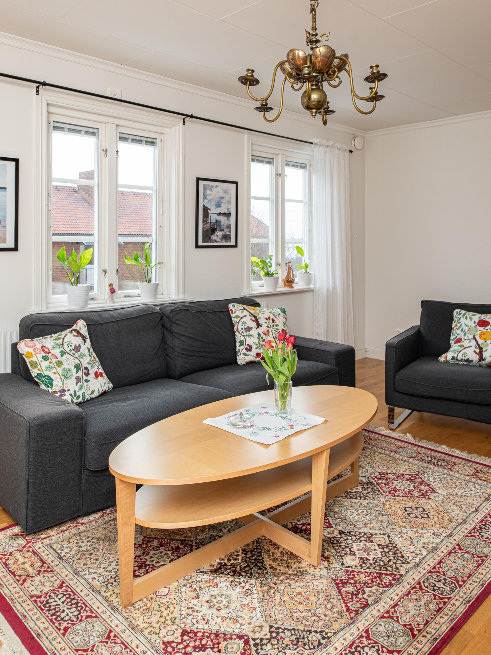 Du kan gå runt hela entréplan så vardagsrummet nås både från köket och hallen. Här ligger ett fint parkettgolv och tre fönster ut mot havssidan som ger fint ljusinsläpp.