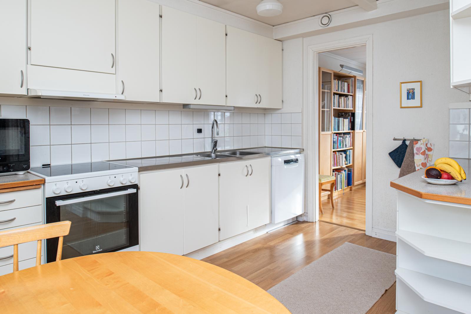 Köket in till vänster har matplats vid fönstret ut mot gatan och gott om skåp och bänkytor för matlagning. Kyl och frys, spis och diskmaskin.