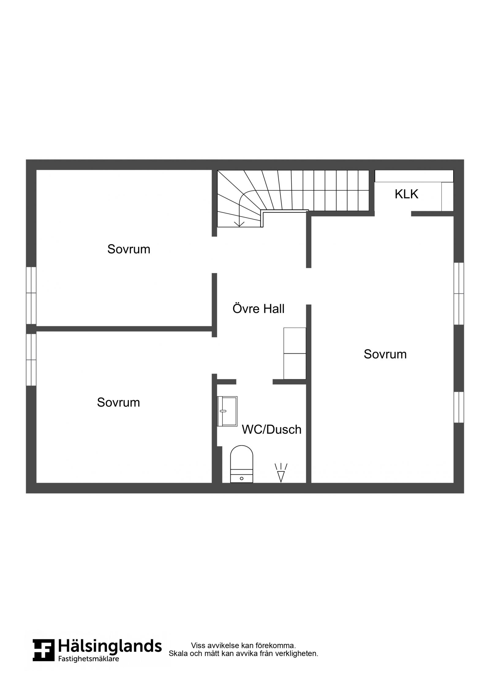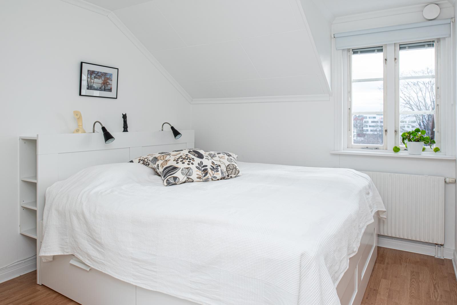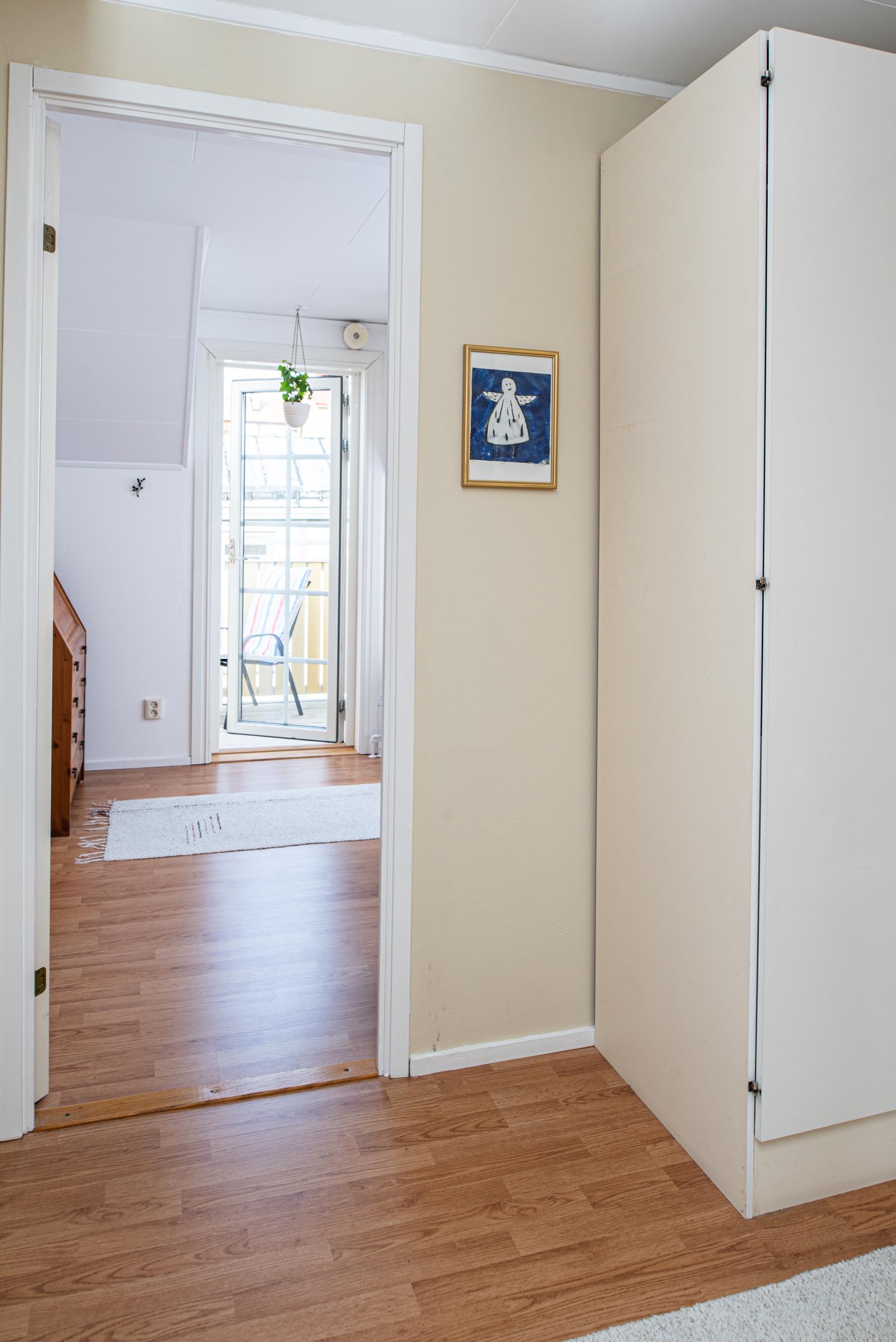 Övre plan är en sovrumsavdelning med tre sovrum och ett badrum. I hallen finns det två garderober. Två av sovrummen har lösa garderober och i det tredje sovrummet finns en klädkammare. I stora sovrummet finns dessutom en dörr till en nybyggd balkong med kvällssol. Intill sovrummen ligger badrummet med våtrumsmatta, duschhörna och handdukstork.