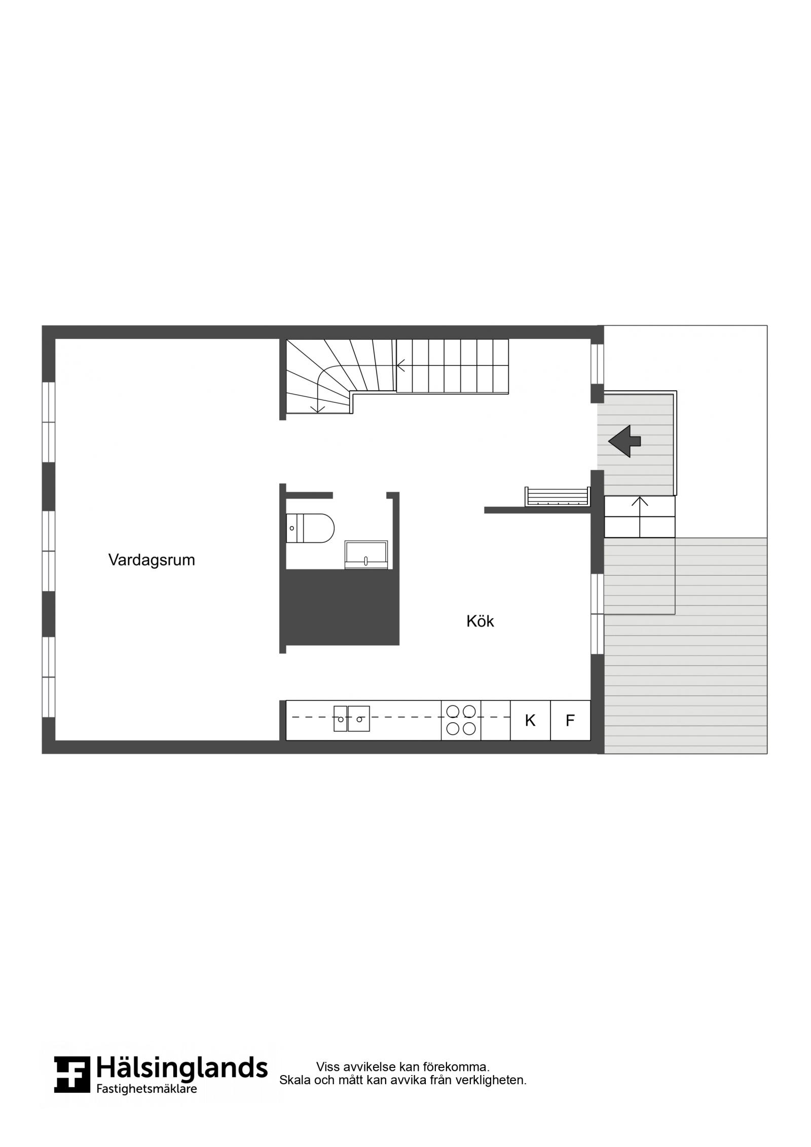 En trappa ned från entréplan har du ett stort allrum med ekparkett och dörr ut till en altan under tak. Denna ingång kan du även använda när du kommer från garaget. Nedanför altanen finns en rabatt och två vinbärsbuskar.