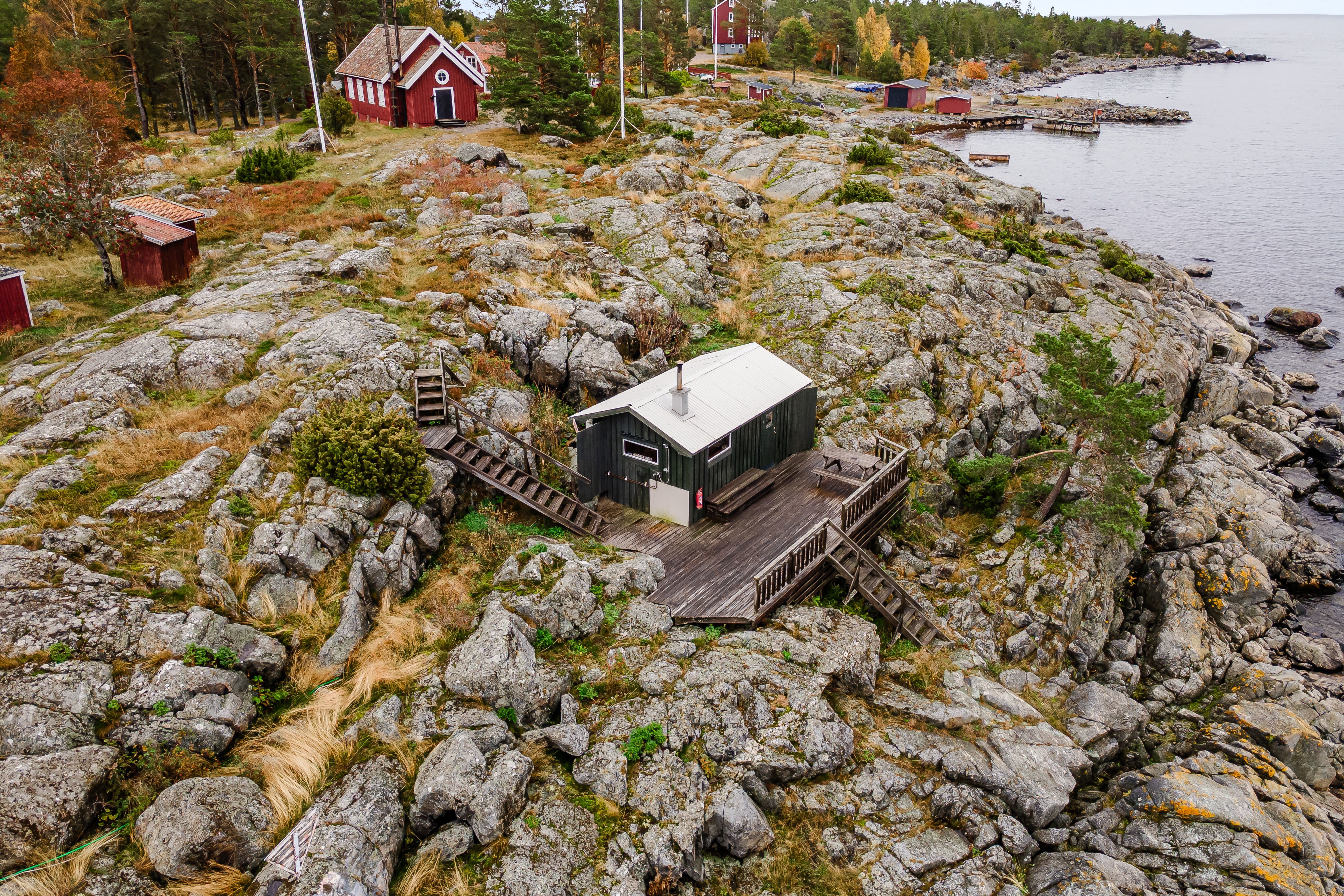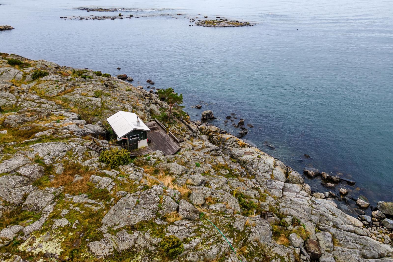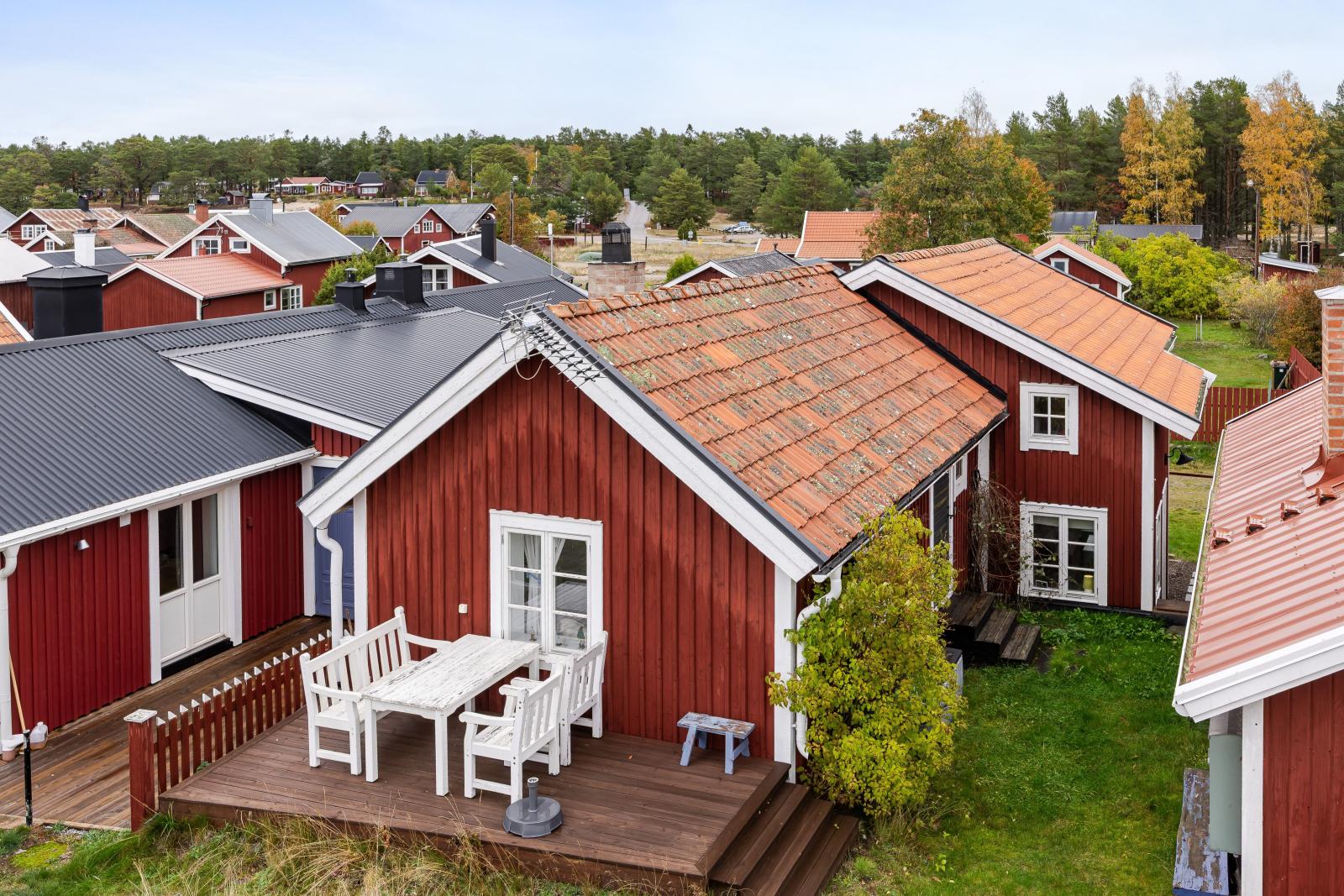 På baksidan av huset finns en altan i sydvästläge som vetter mot allmänningen – en perfekt plats att samla vänner under ljumma sommarkvällar. Promenerar du vidare över allmänningen ligger samfällighetens charmiga dass på rad. Dasset som hör till Hölick 606 används idag inte, men kan med fördel nyttjas som redskapsbod. Nedanför, närmare havsbrynet, ligger den gemensamma bastun – en uppskattad samlingsplats efter doppet eller kvällspromenaden.
