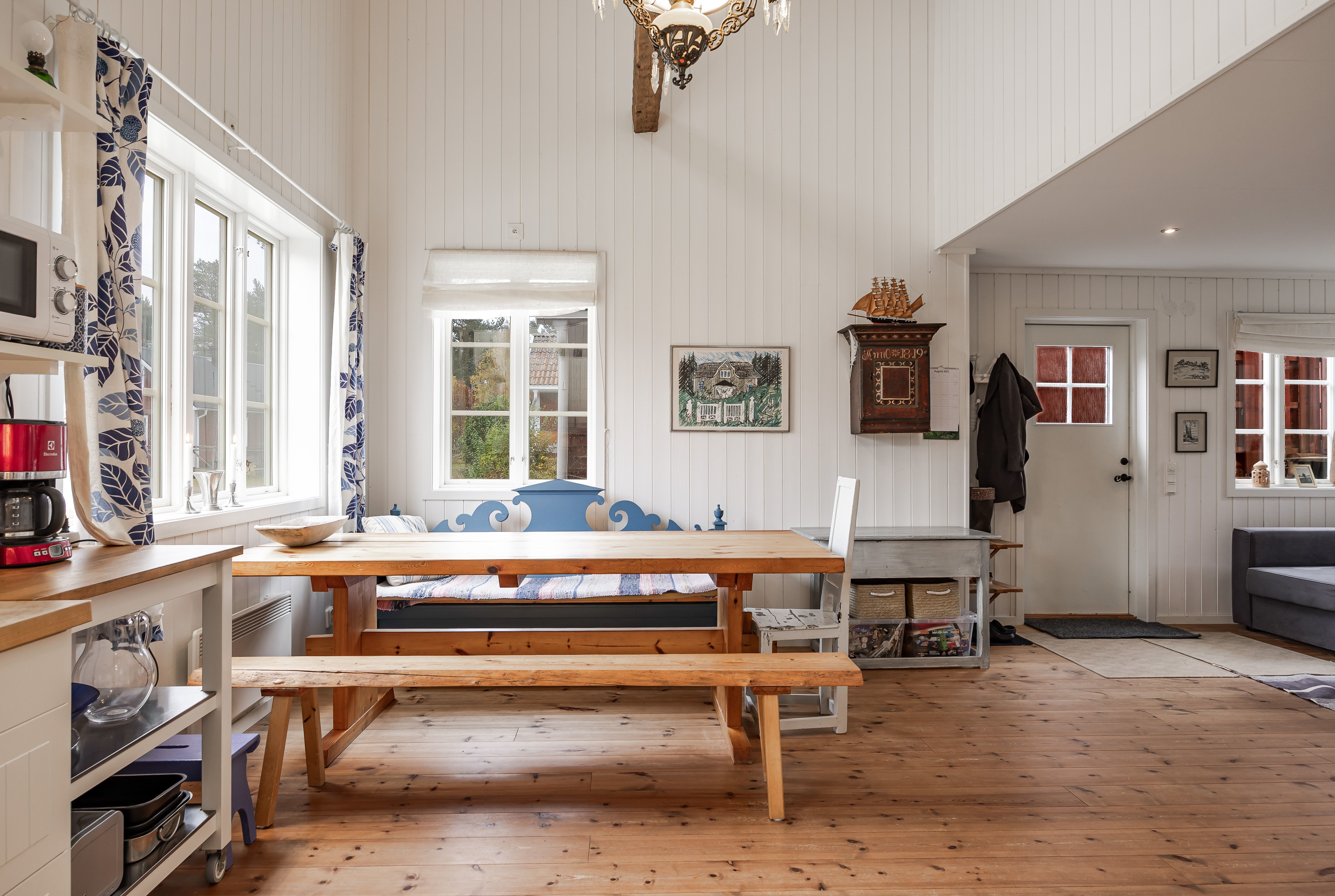 Det första du möts av när du kliver in är hemmets nyare del från 2012 – en ljus och inbjudande del med kök som har takhöjd upp till nock och vackert synliga timmerbalkar. Här skapas en härlig rymd där kök, stor matplats och loungedel samspelar i en öppen, social yta. I anslutning finns ett rymligt badrum med gott om utrymme.