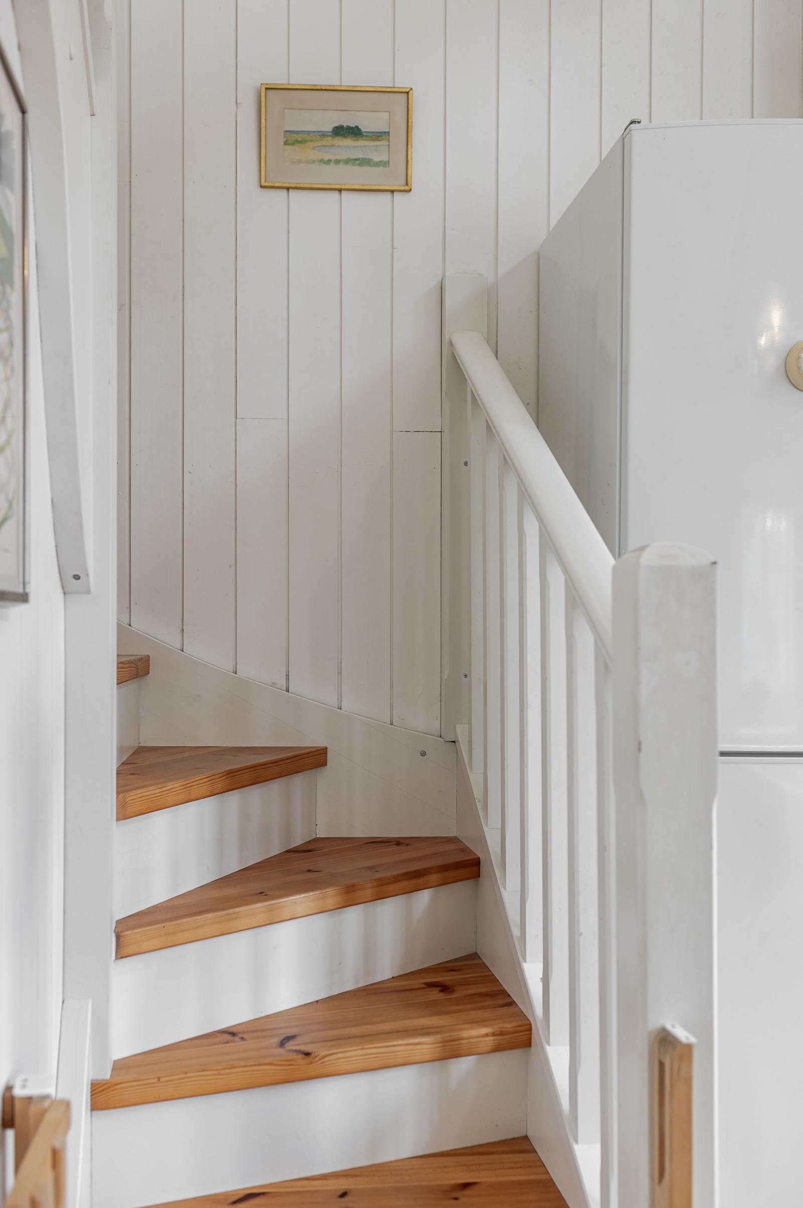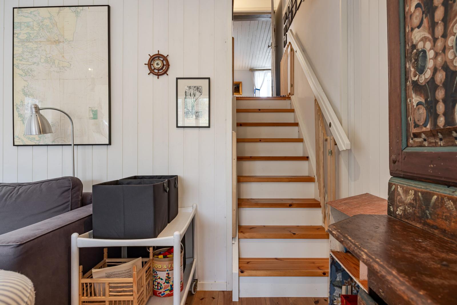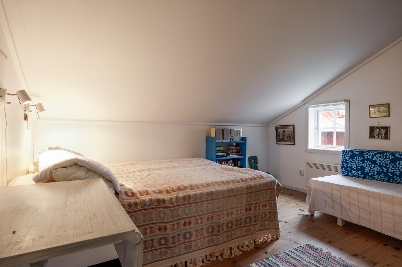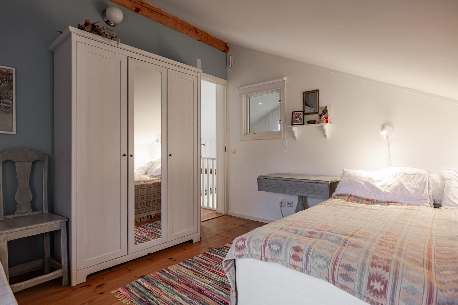 Via trappan upp till loftet i den nyare delen når du två väl tilltagna sovrum. Båda rummen har plats för två sovplatser vardera, samt utrymme för förvaring, skrivbord och en dagbädd – perfekt för både vila och sällskap.