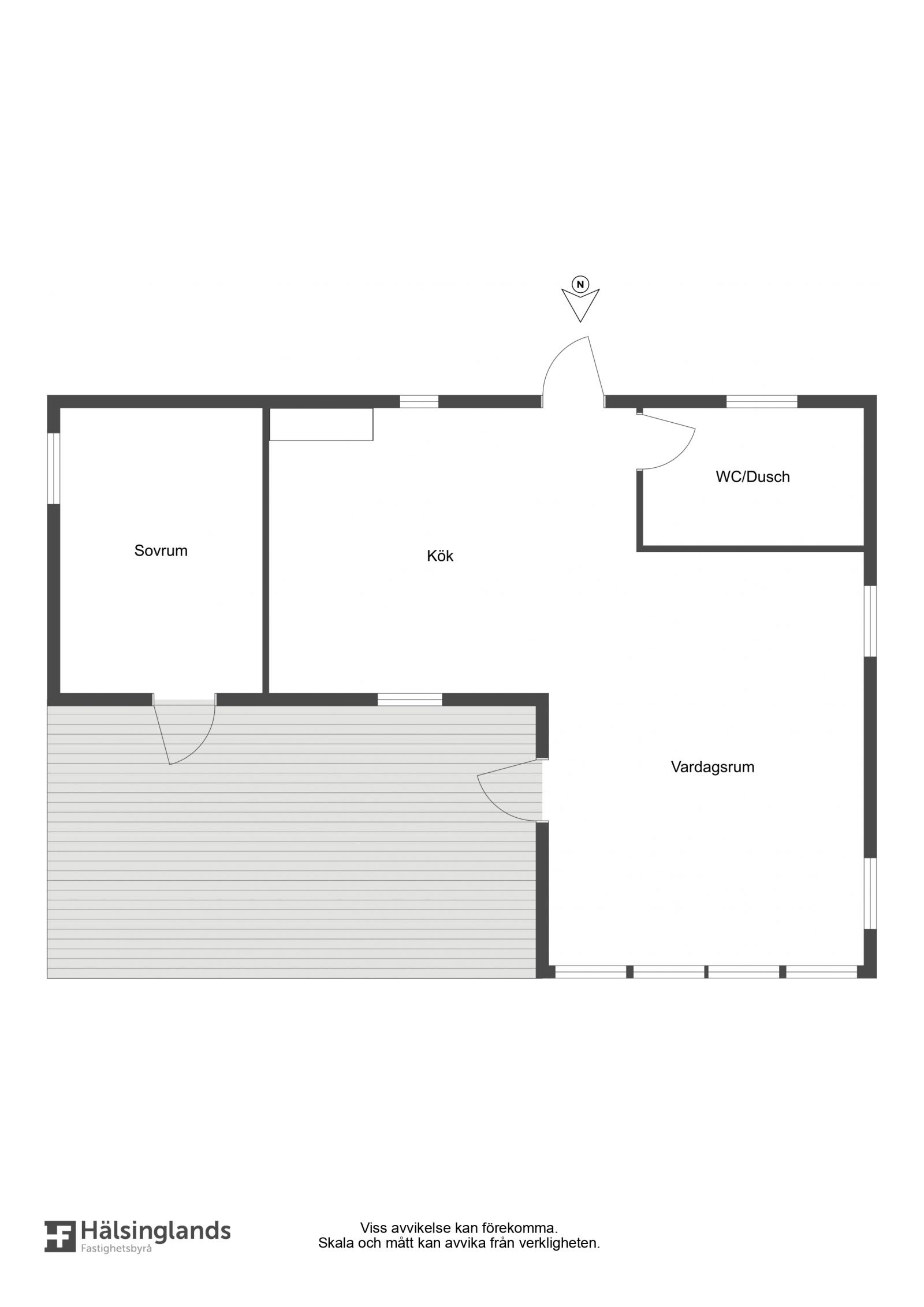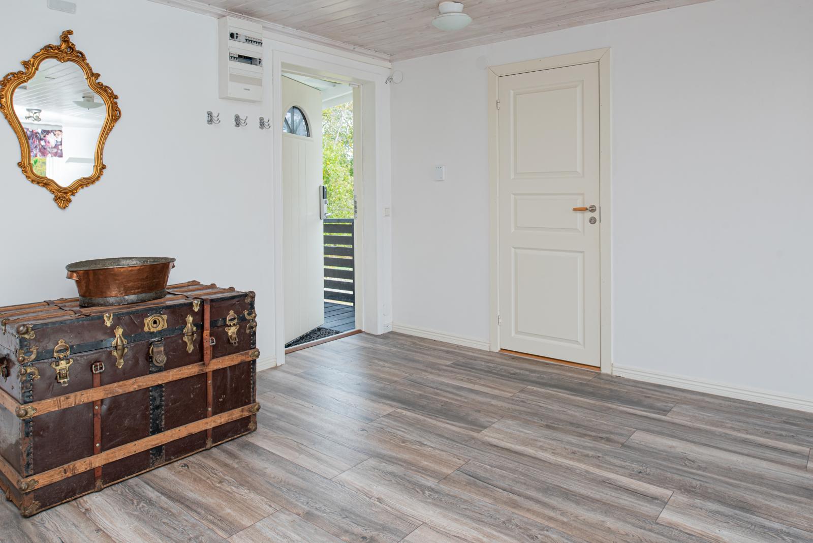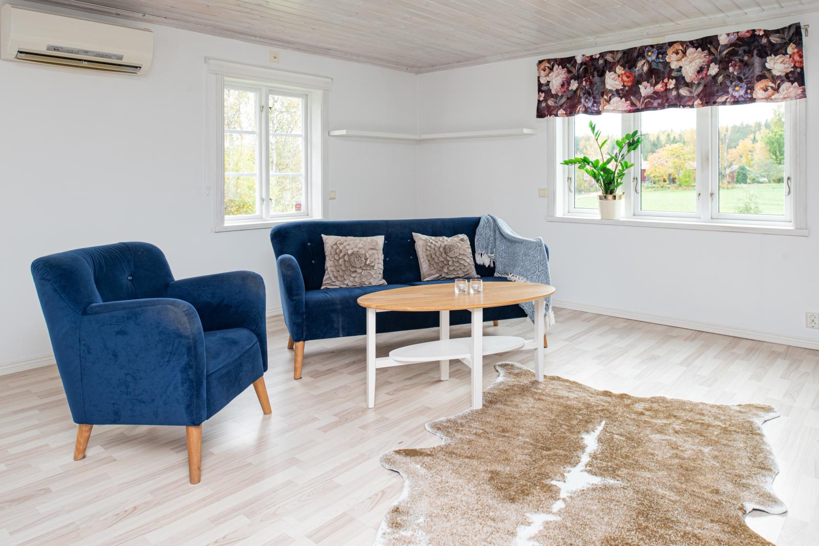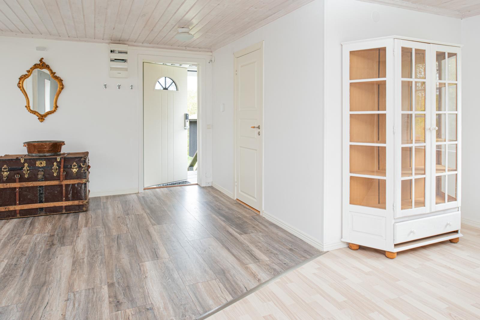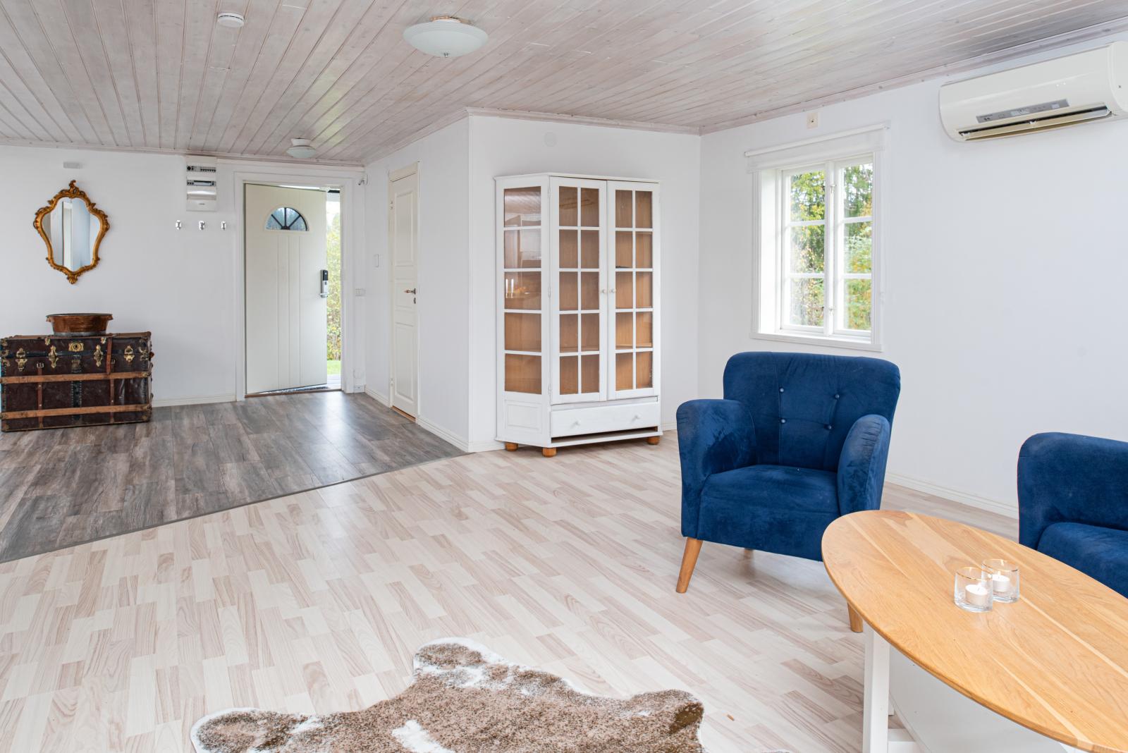 Hallen, köket och vardagsrummet har en öppen luftig planlösning. Här har du fönster i alla väderstreck så du får fint ljusinsläpp. Vid entrén finns även badrummet och innanför köket har du ett sovrum.