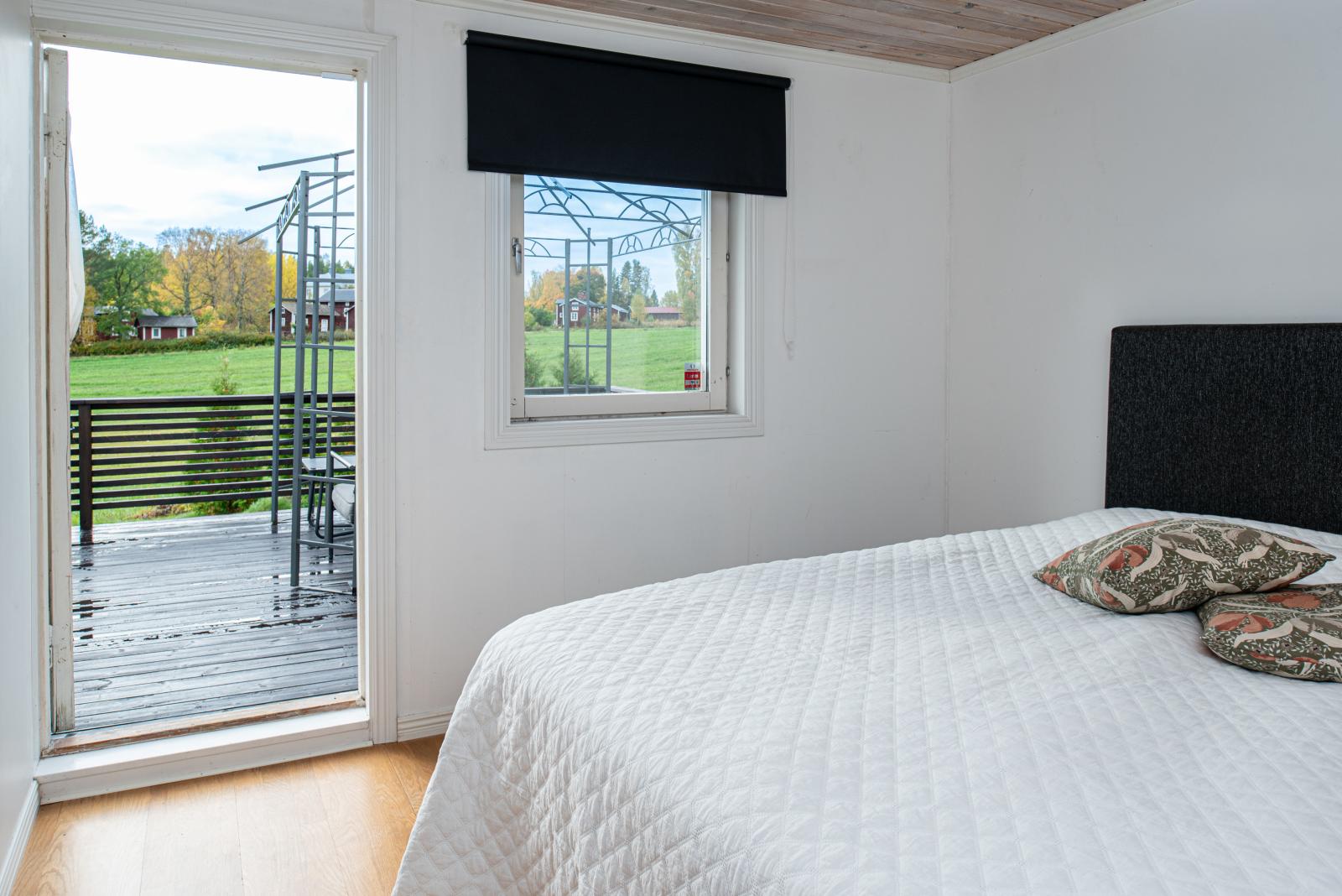 Sovrummet har dörr ut till altanen och hel garderobsvägg.