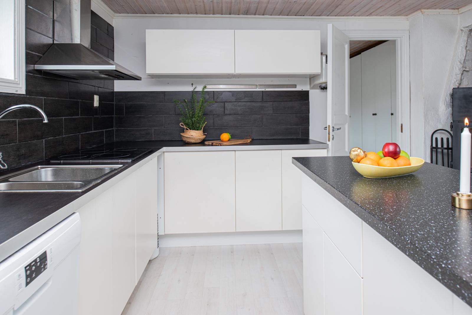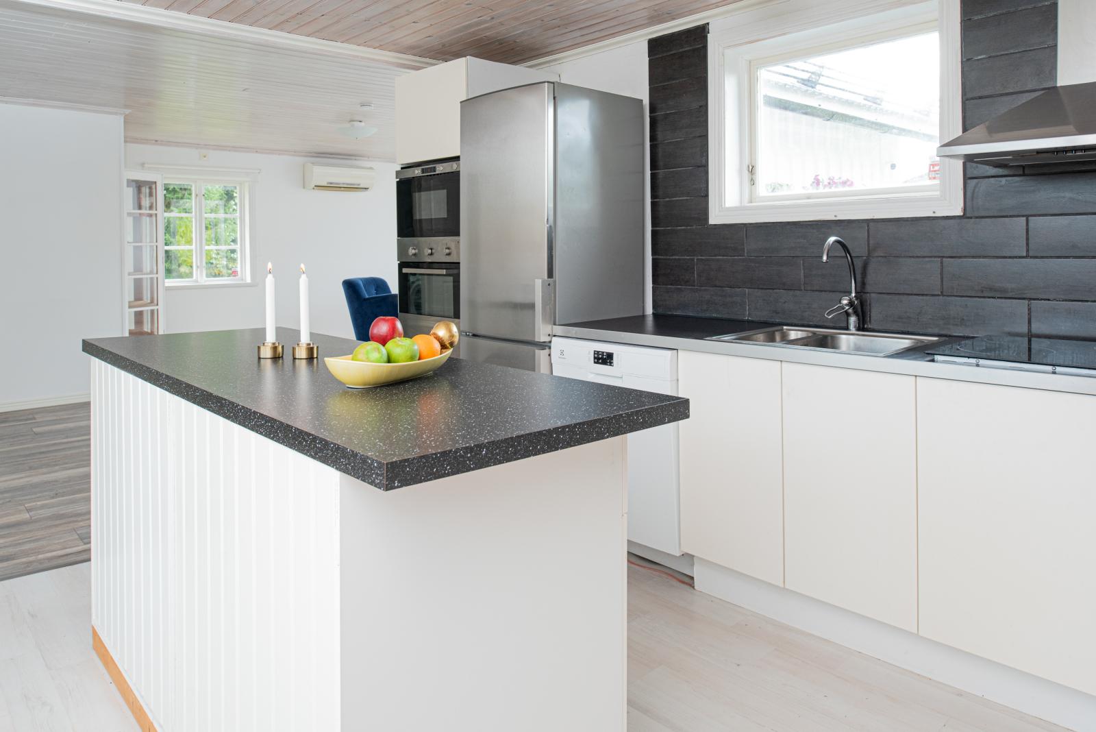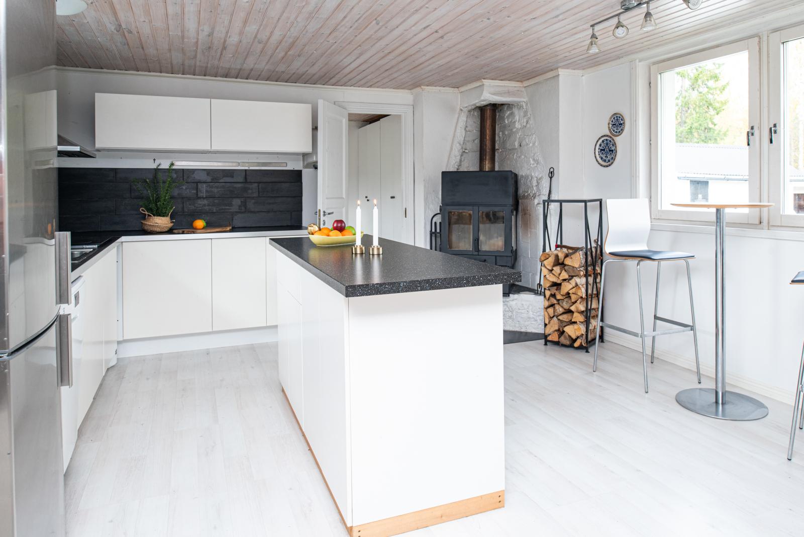 Köket har köksö och en täljstenskamin som tillsammans med luftvärmepumpen sprider värme till hela huset.