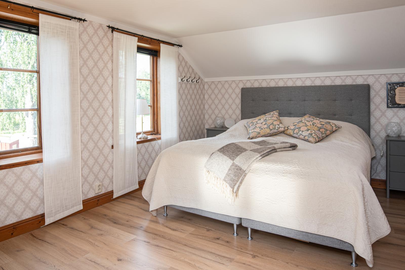Från logdelen finns en rejäl trapp upp till övre plan. Även här finns en stor öppen yta med högt i tak och riktigt plankgolv. Ett kallförråd men även ett isolerat rum som kan vara förråd eller sovrum.
