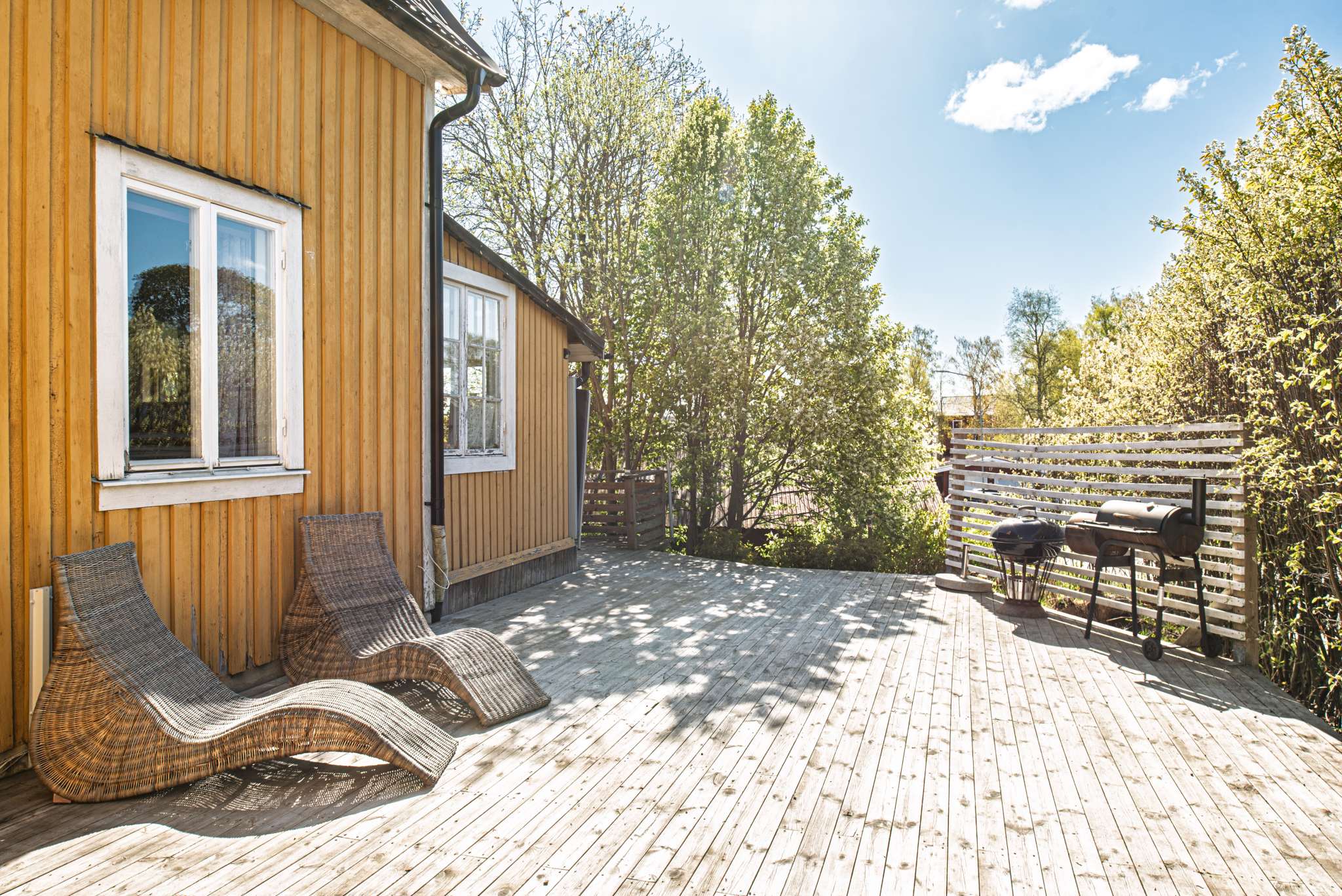 Här kan du njuta av uteplats i olika väderstreck med ett trädäck som löper från bostadens framsida och vidare längs med kortsidan intill den inglasade altanen och med trapp ned till den isolerade friggeboden.