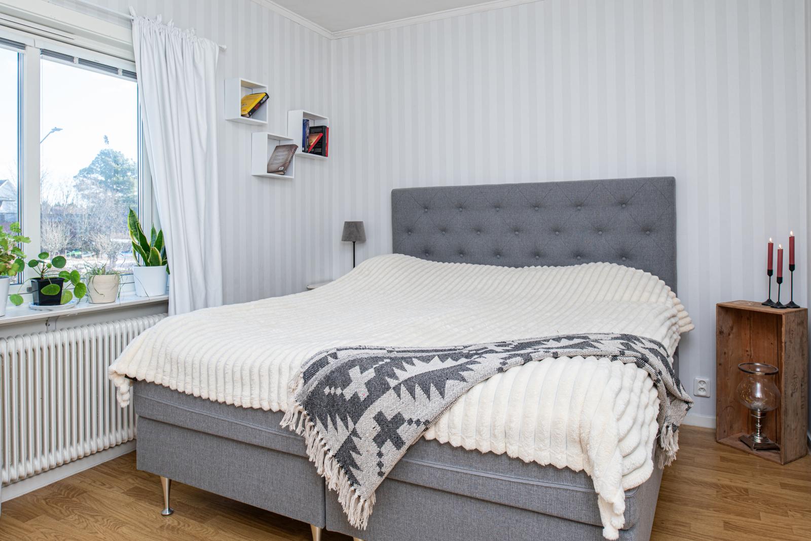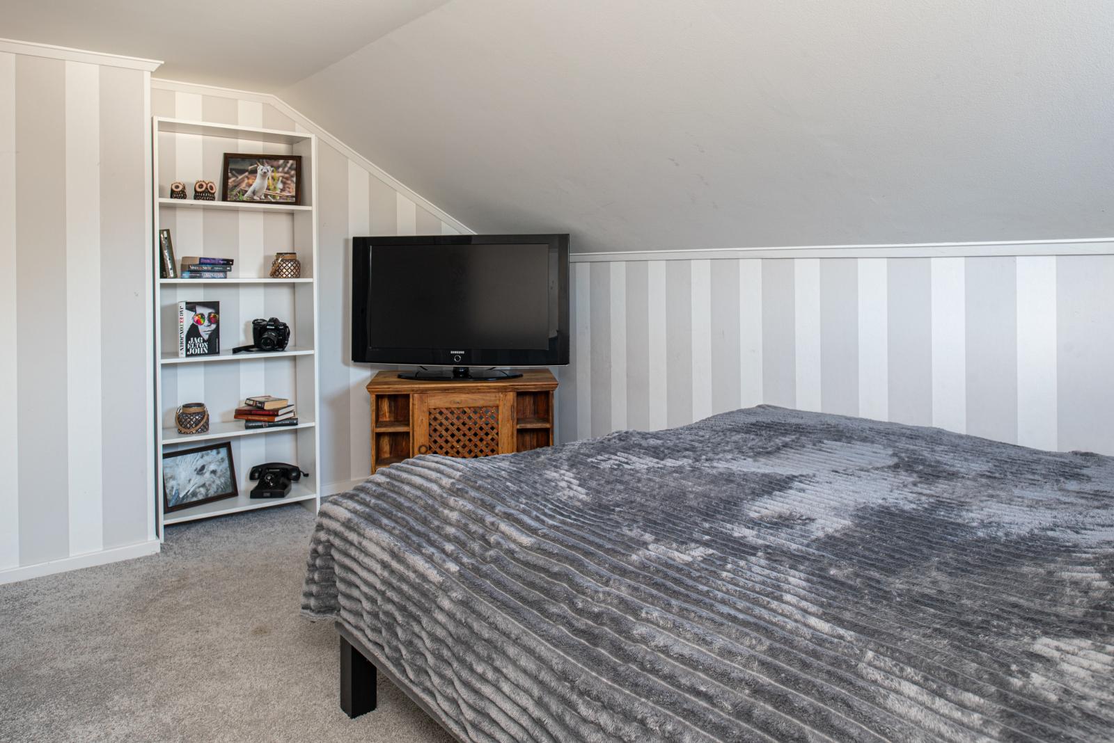 Vi går in igen och hittar på entréplan, 2 sovrum, varav ett idag har genomgång för att nå det övre planet. Det ena sovrummet har en stor garderob som medföljer köpet och det andra sovrummet har platsbyggd förvaring som ingår. En trappa upp finns ytterligare ett sovrum samt förråd.