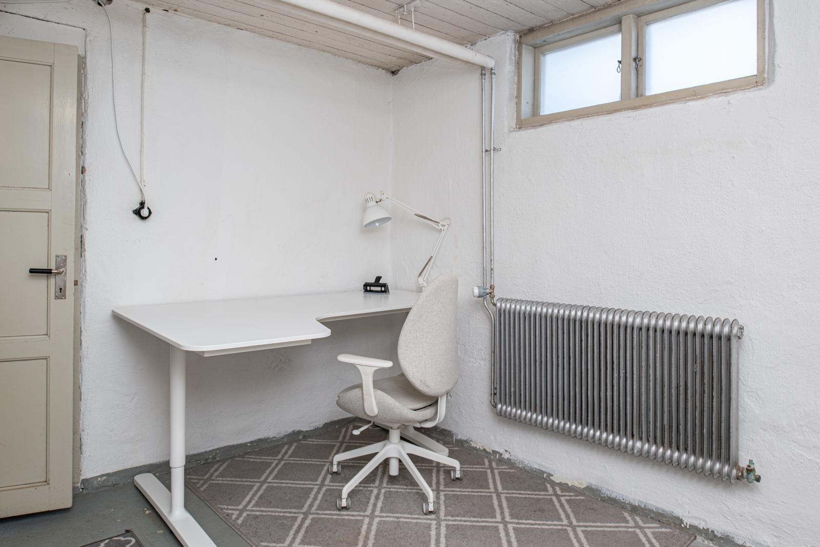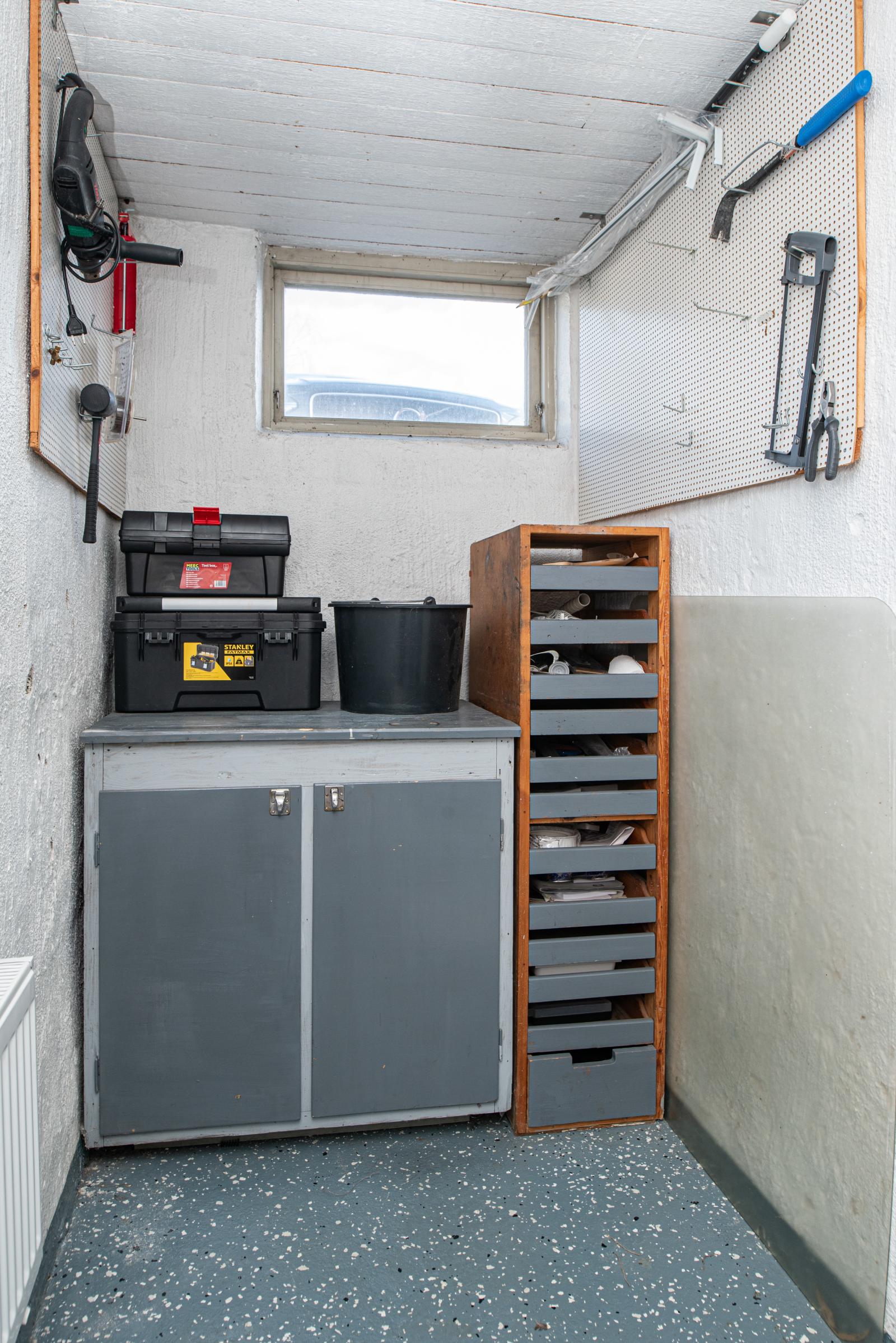 Källarplanet rymmer tvättstuga med tvättmaskin och torktumlare från år 2021 och ett stort förråd samt matkällare.