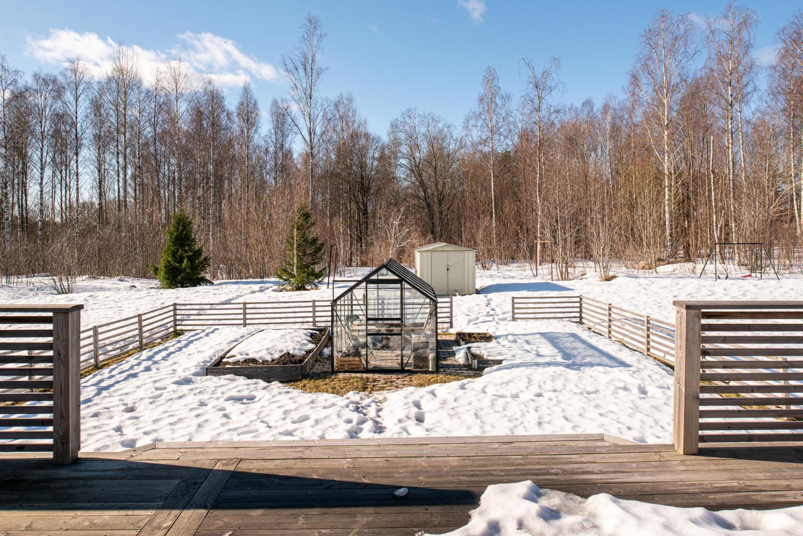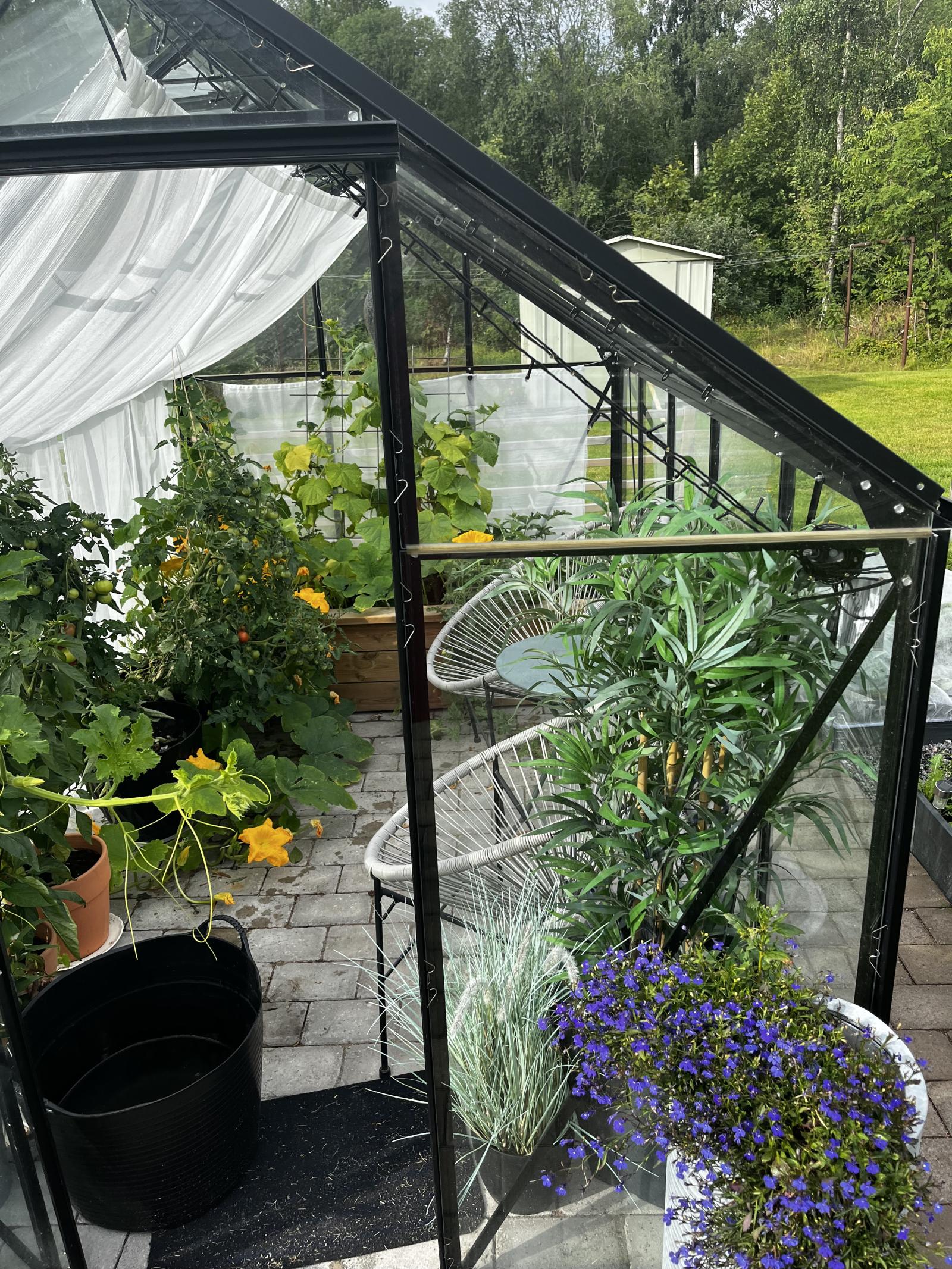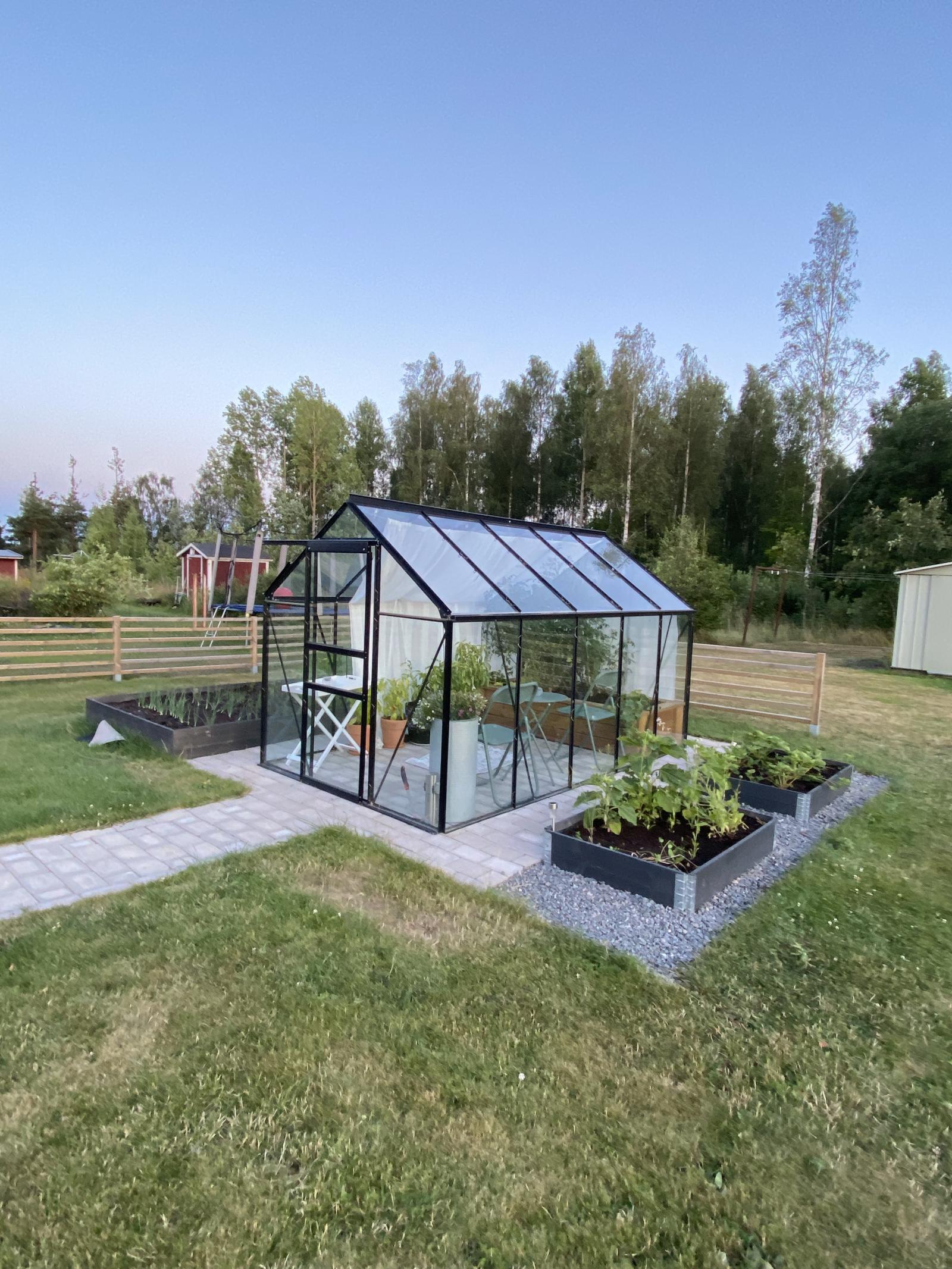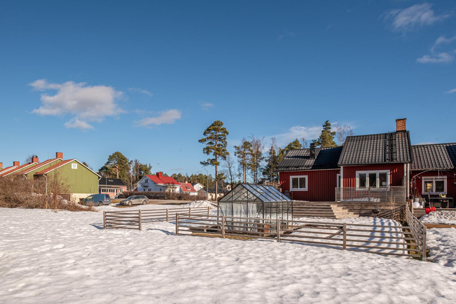 Tomten bjuder på en härlig trädgårdsmiljö där du kan njuta i lugn och ro. Mitt i denna idyll står ett växthus, redo för dig som drömmer om odling, avkoppling eller kanske en mysig plats för sommarkvällar.