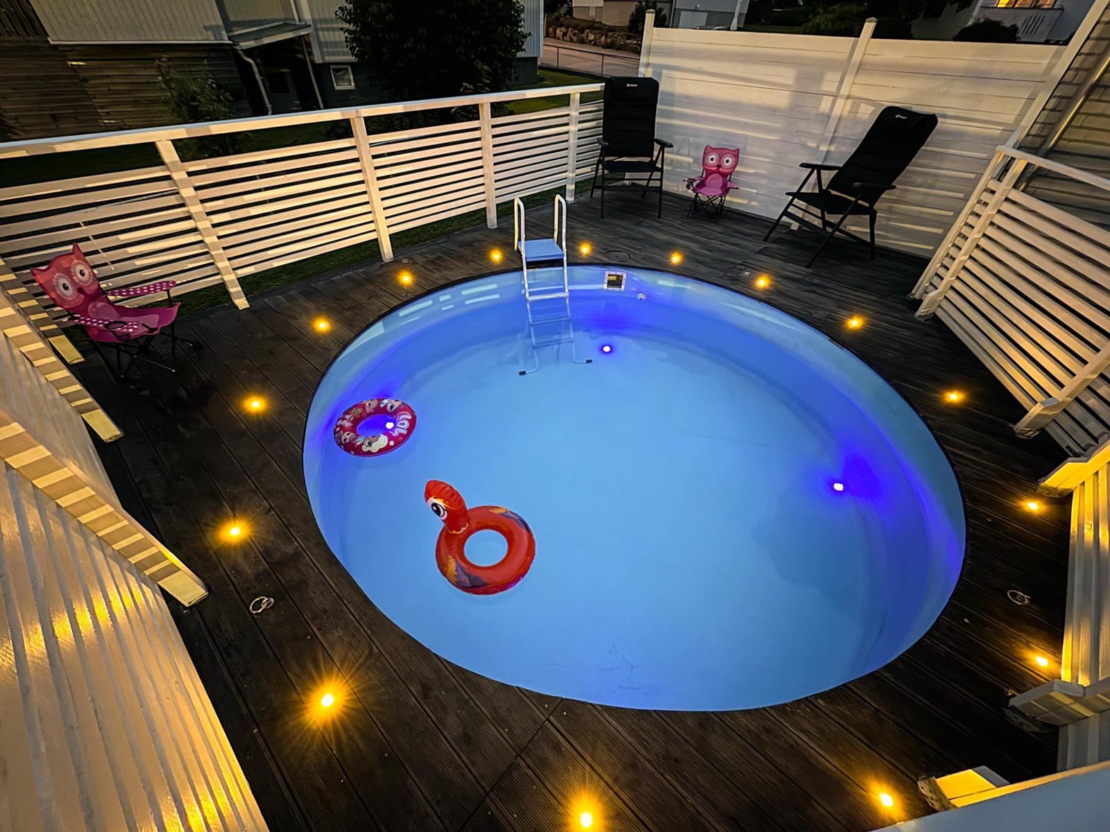 Huset har ett härligt och högt söderläge på lugn gata med lite trafik. Den nyrenoverade verandan rymmer en pool om 3,5 x 3,5 meter med nytt staket. Omkringliggande plats för loungegrupp och solstolar - allt som behövs för att lugnt kunna stanna hemma de fina semesterdagarna och bara njuta. Uteplatser att välja efter väder. Gång- och cykelväg till skola, närhet till skog och eljusspår.