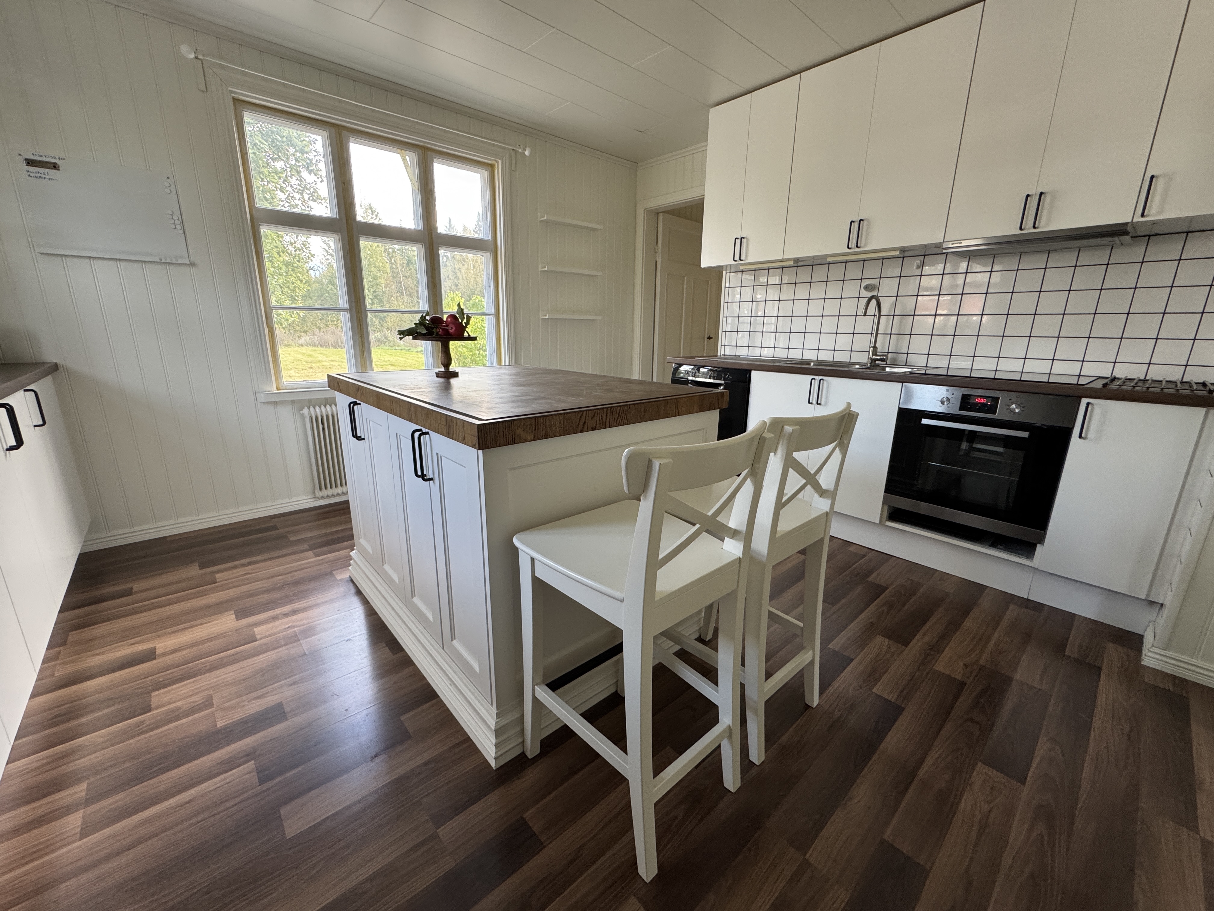 Köket är stilfullt renoverat med vita skåpluckor, svarta beslag och en snygg bänkskiva som skapar en modern och inbjudande känsla. Köksön blir en naturlig samlingspunkt. Från köket når du matrummet med en charmig öppen spis, som i sin tur leder vidare till det rymliga vardagsrummet med utgång till altanen.
