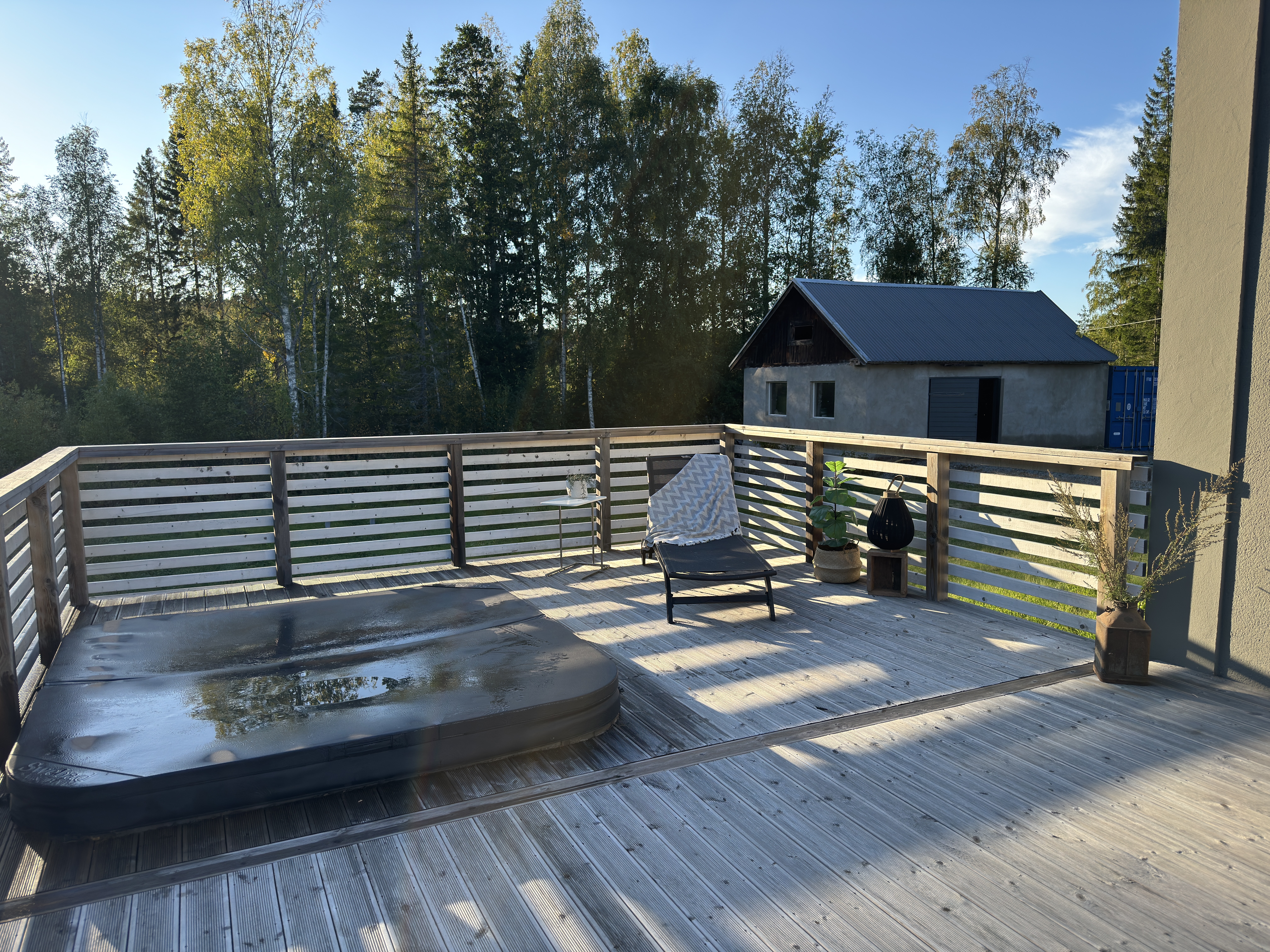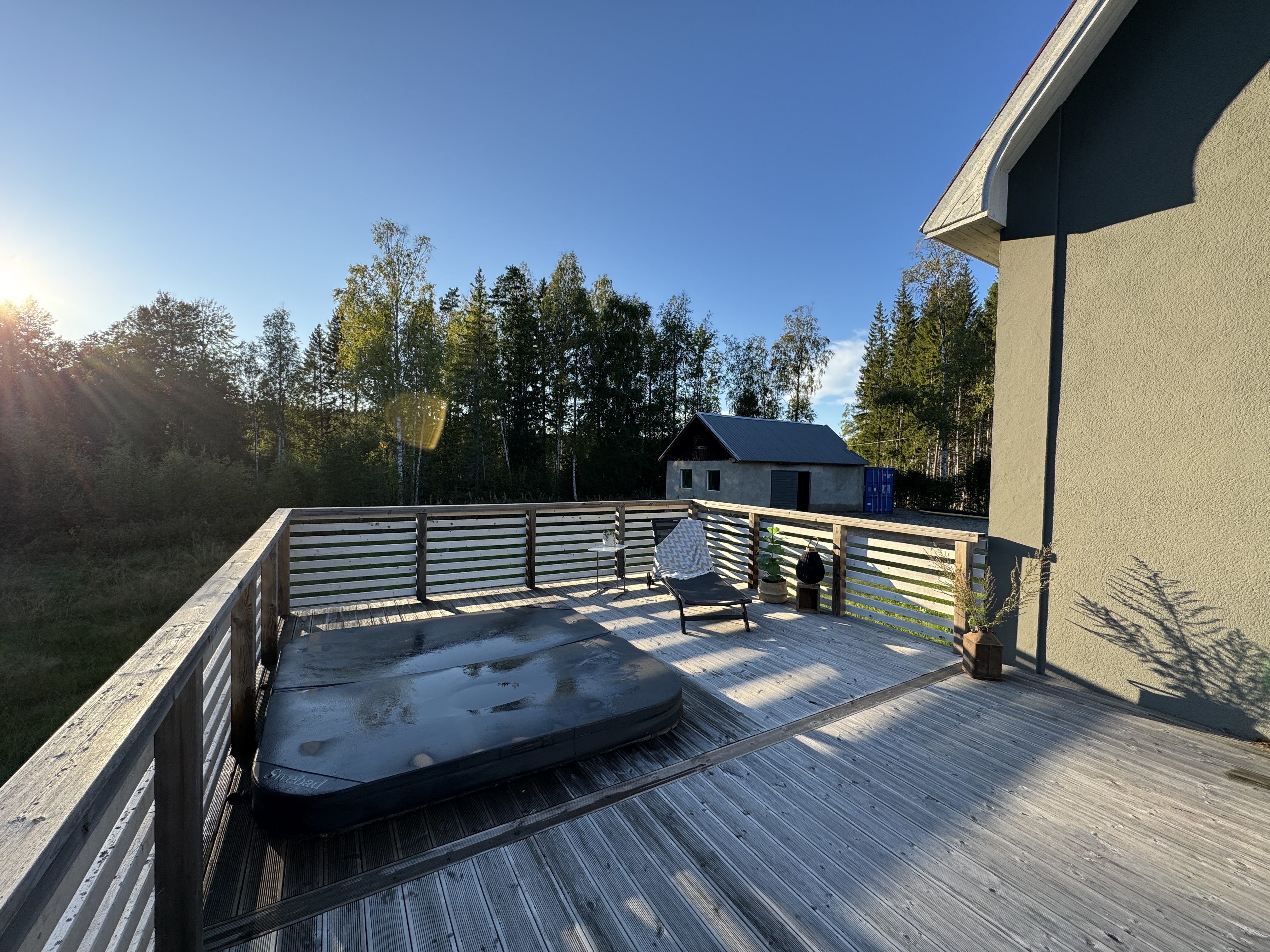 Rymligt hus med stor tomt, altan med bubbelpool och många möjligheter.