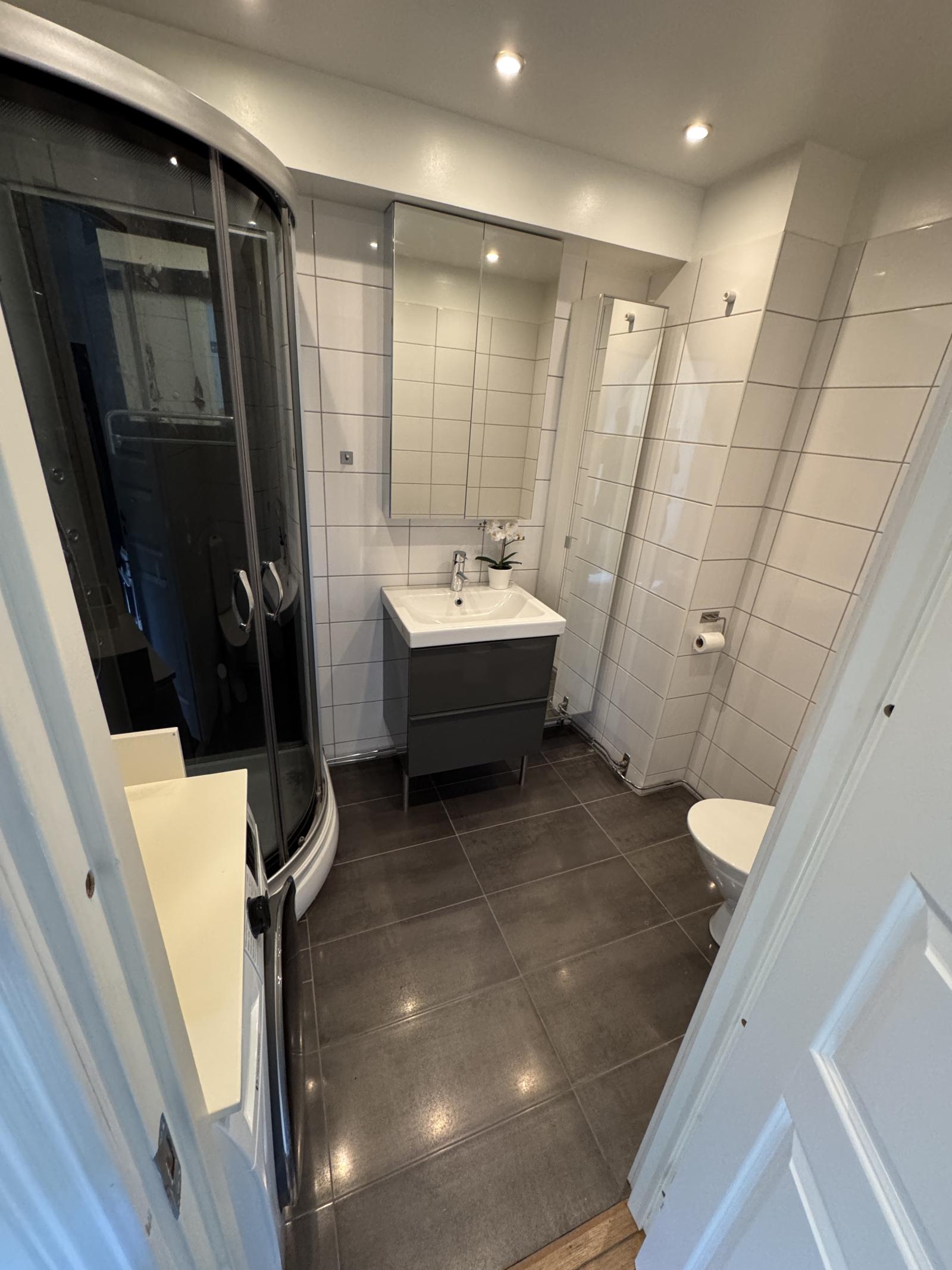 När du kliver in i huset möts du av en välkomnande hall med plats för ytterkläder och skor. Intill hallen finns ett helkaklat badrum med duschkabin, kommod, spegelskåp och tvättmaskin.