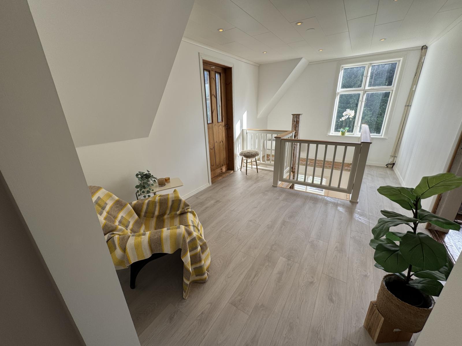 På övre plan finns i dagsläget två större sovrum samt ett utrymme för den som vill färdigställa ett extra badrum. Här finns också möjlighet att återställa den tidigare balkongen.