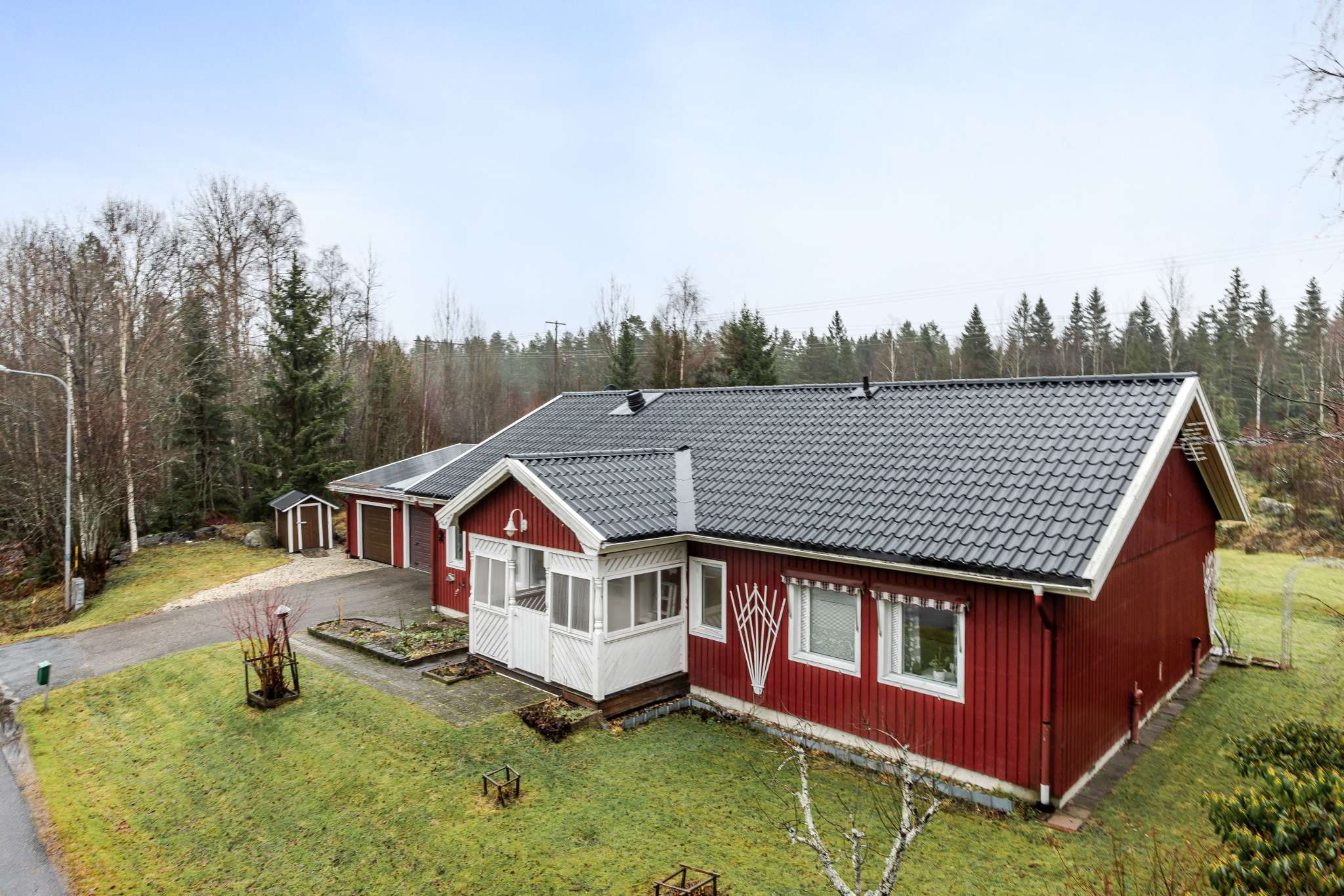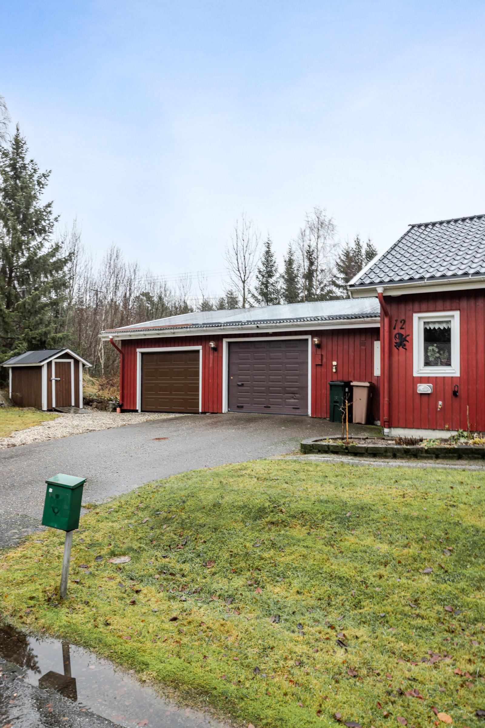 Vidbyggt finns 2 st garage med automatiserade portar, samt flertal förrådsutrymmen, snickarbod samt utrymme för bergvärmepumpen.