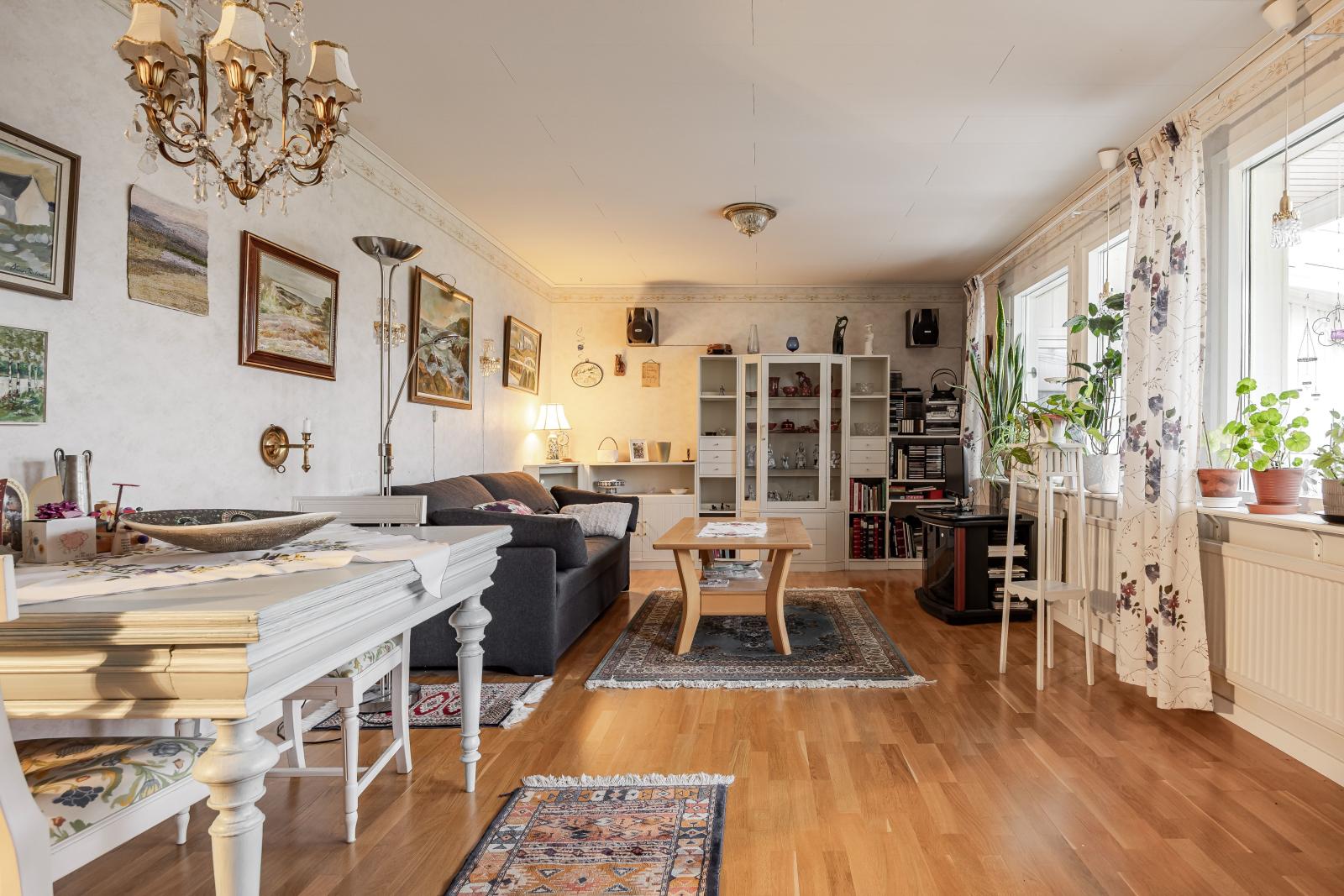 Vardagsrummet har parkettgolv samt fint ljusinsläpp från det stora fönsterpartiet. Här finns även altandörr som leder ut till altanen och trädgården på den insynsskyddade baksidan. Altanen har även en härlig inglasad del perfekt för dagar när vädret så kräver samt för att förlänga utesäsongen.
