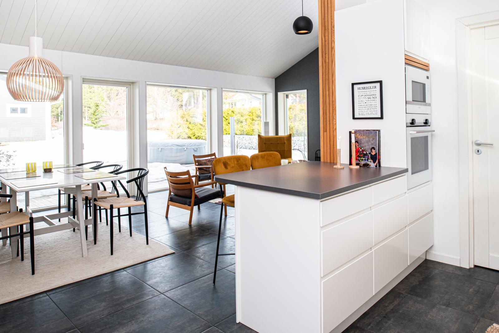 Köket har gott om bänkyta och rymmer plats för flera i köket. Med öppet in mot allrum och matplats kan du fortfarande ha kontakt med gästerna medans maten tillreds. Innanför köket finns groventrén vilken du praktiskt når genom tvättstugan.