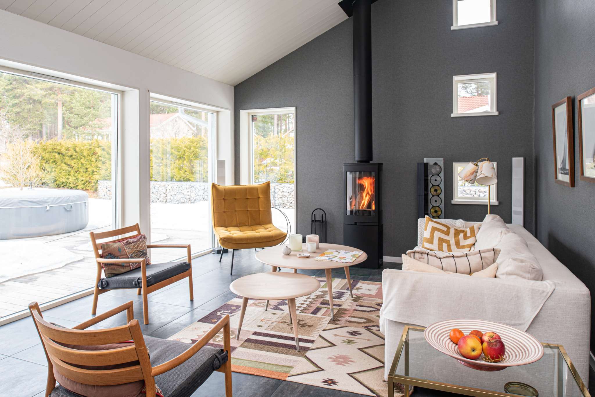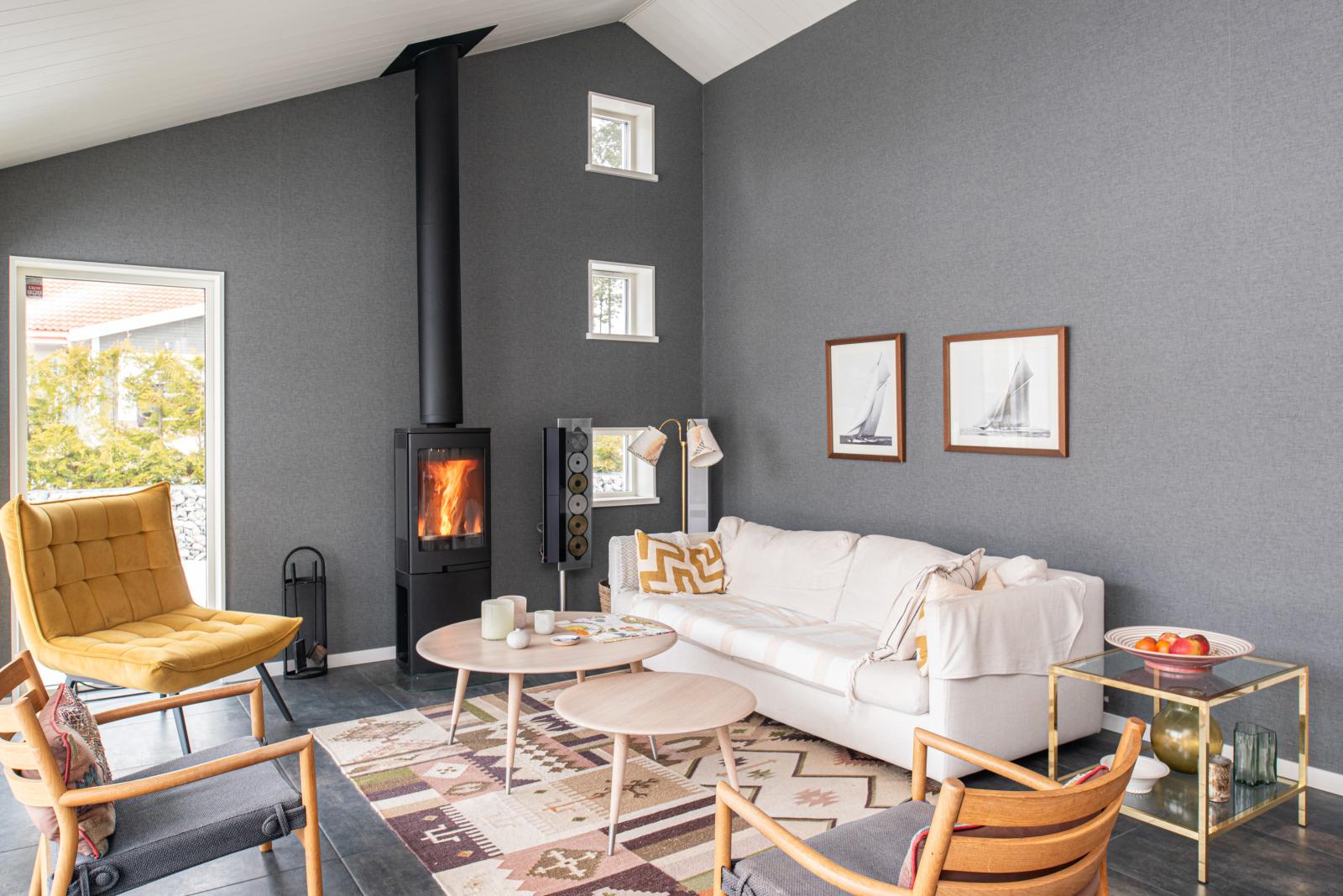 Allrummet har nyligen fått en braskamin, centralt placerad vilket gör den synlig från större delen av huset. Annars är värmekällan en luftvattenpump med vattenburen golvvärme i hela huset.