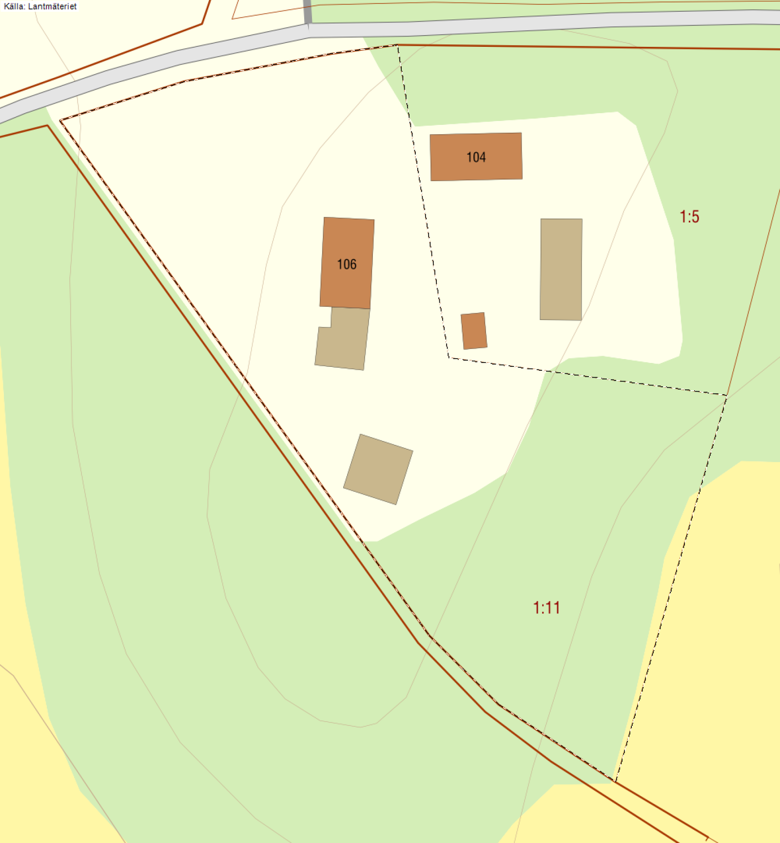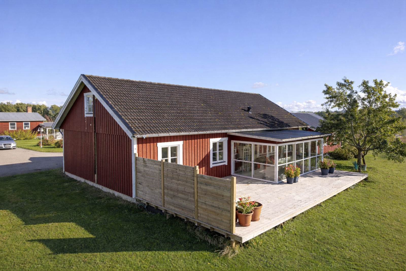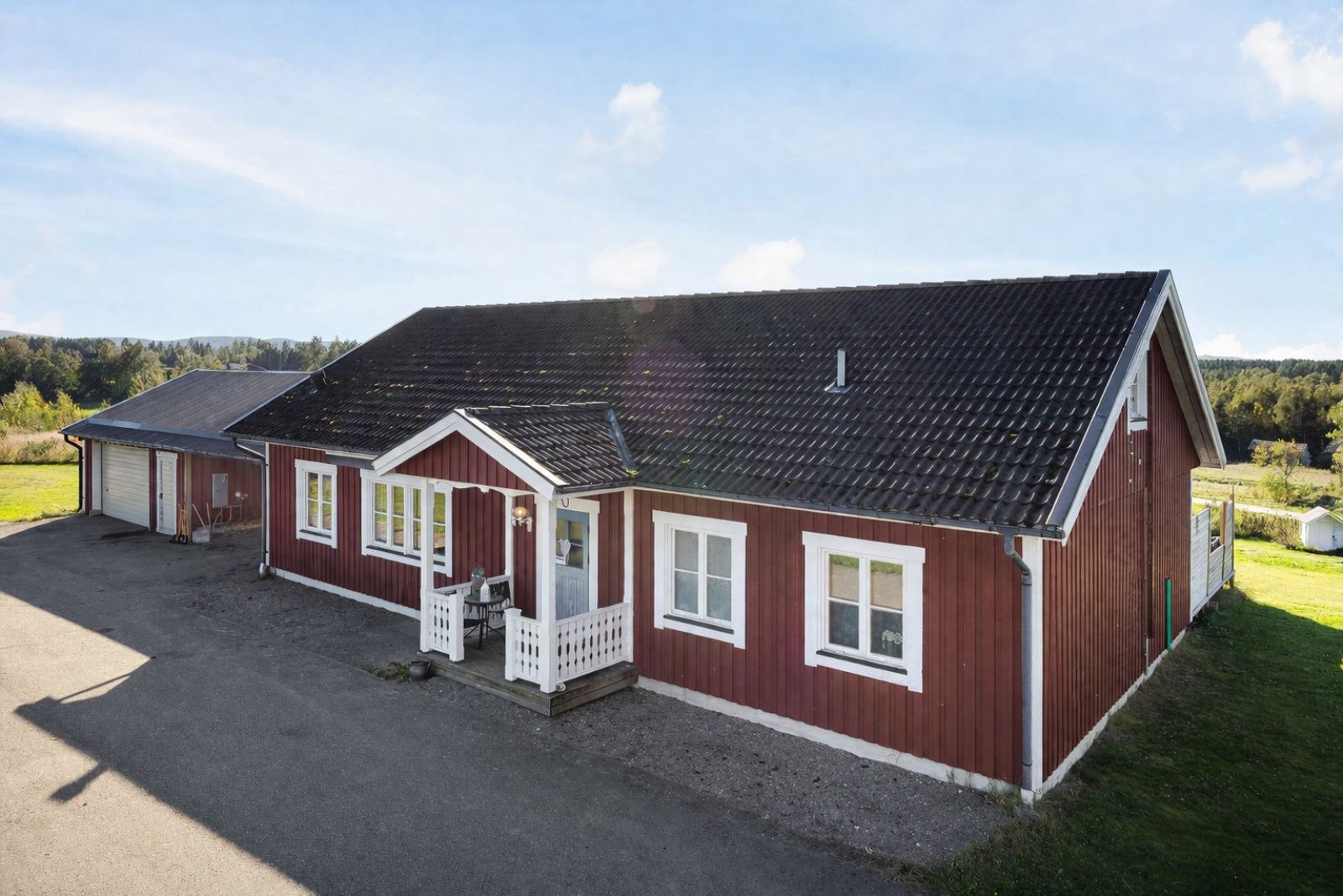 Gårdsplanen är asfalterad och längst in mot skogspartiet ligger ett stort kallgarage i plåt med grusgolv.