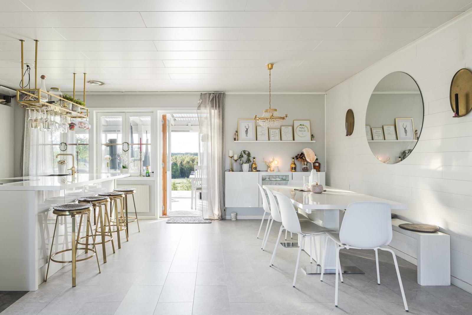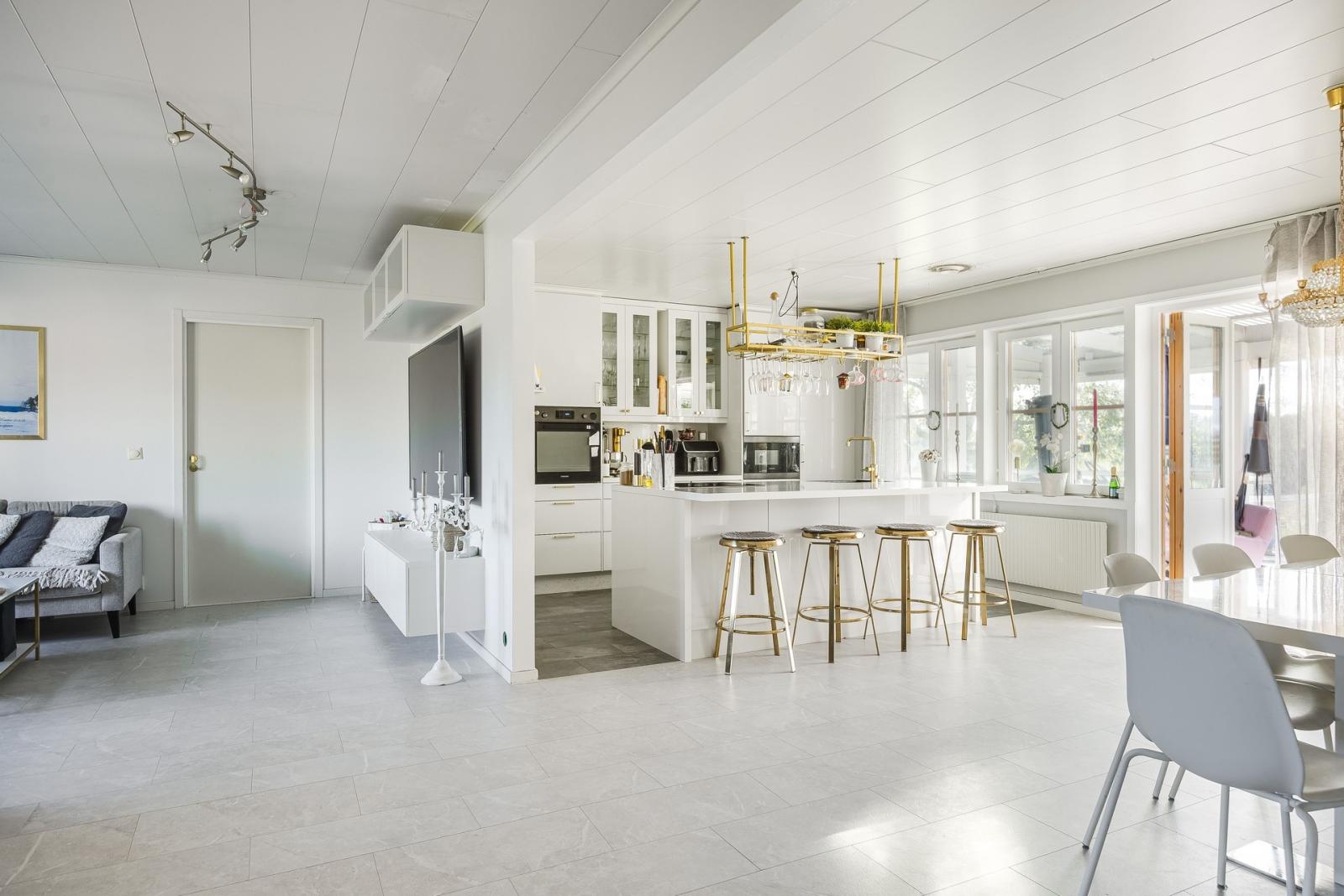 Hallen har platsbyggda garderober med skjutdörrar där man kan gömma undan alla ytterkläder. I nedre plan är det öppen planlösning mellan hall, vardagsrum och kök och det ligger samma ljusgrå golv i alla tre rum. Köket renoverades 2022 då det fick en stor köksö med flera sittplatser samt infälld spis och ho. Hela köket är ljust med vita blanka luckor och infällda vitvaror. Det finns även en stor matplats och dörr ut till den inglasade altanen med härlig utsikt över åkrarna.
