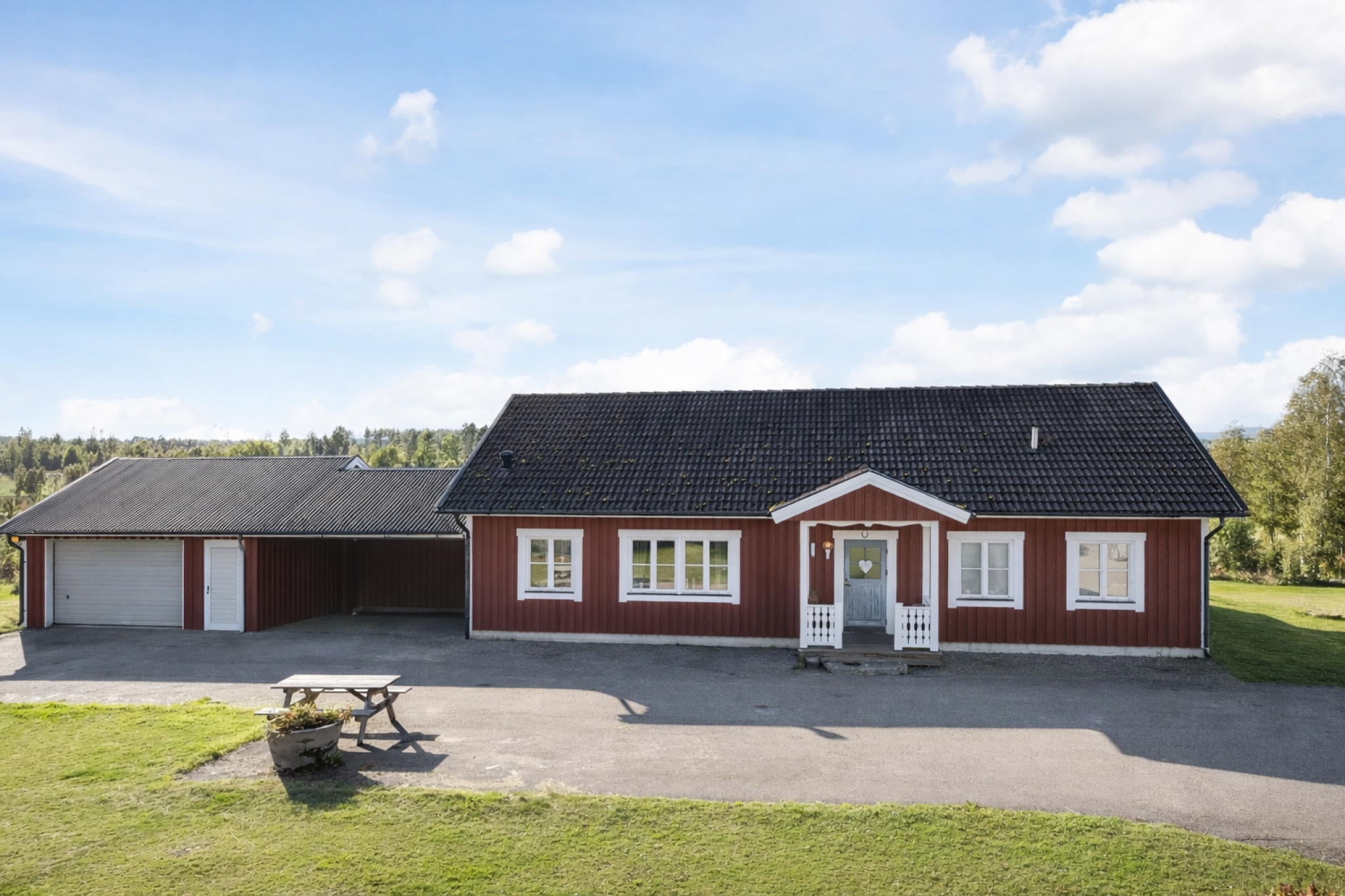 Vidbyggt huset ligger både en carport och ett varmbonat dubbelgarage på betongplatta. Från carporten finns en praktisk groventré in till tvättstugan.