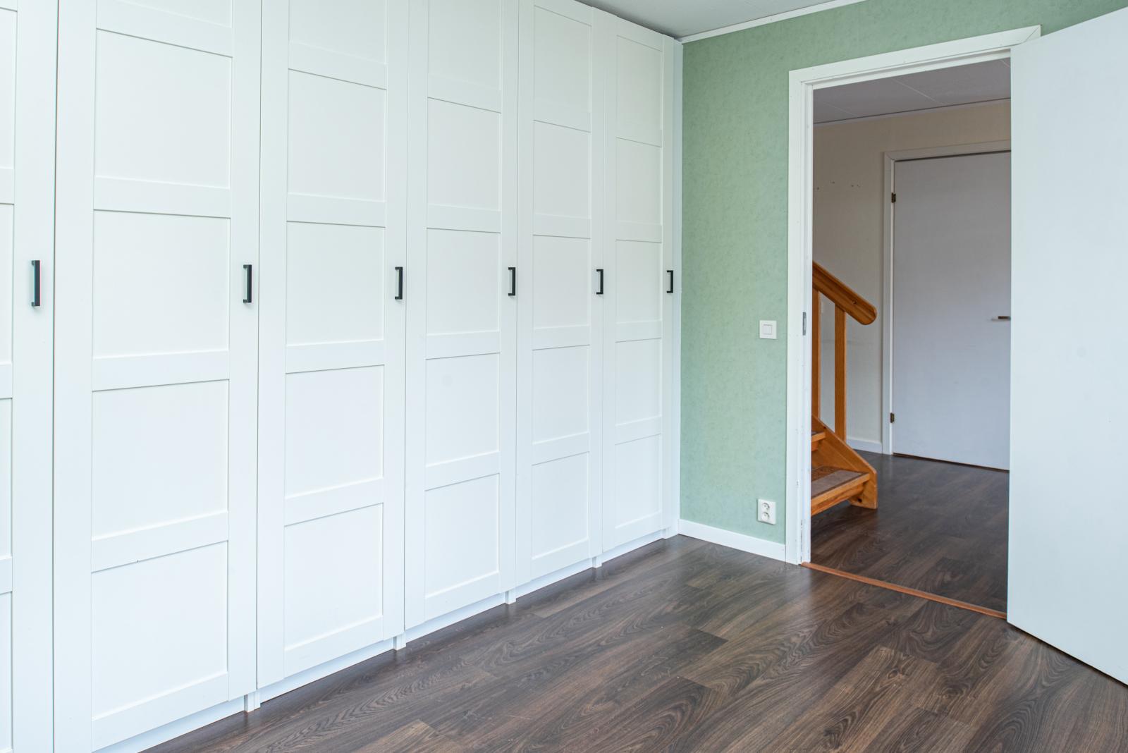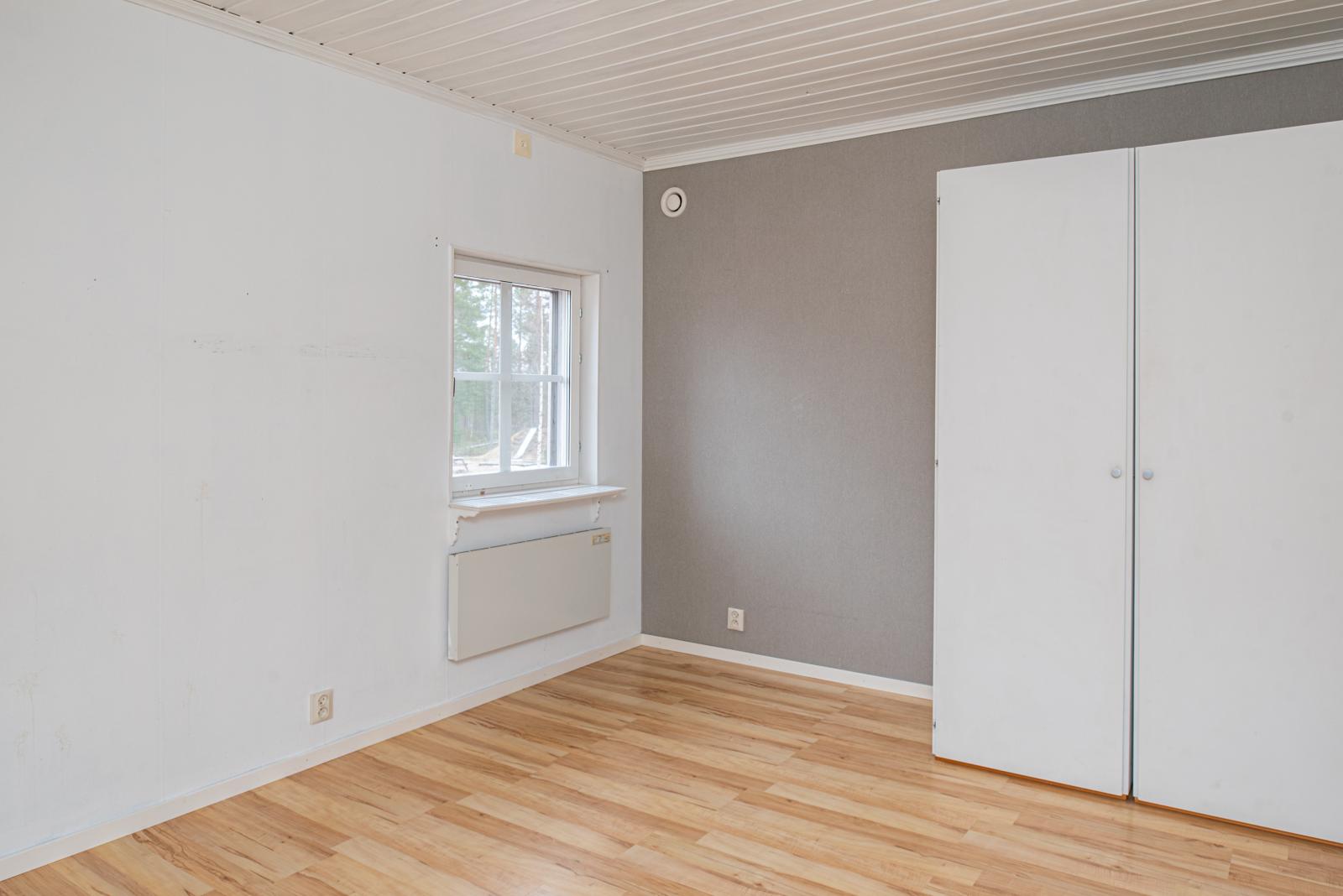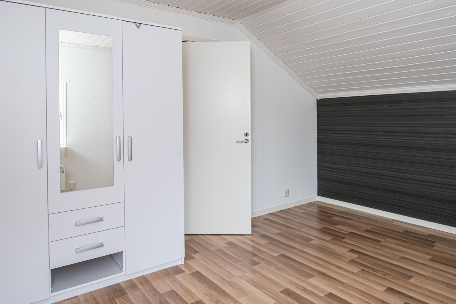 Mot framsidan med dörr från hallen finns ett sovrum med hel garderobsvägg.