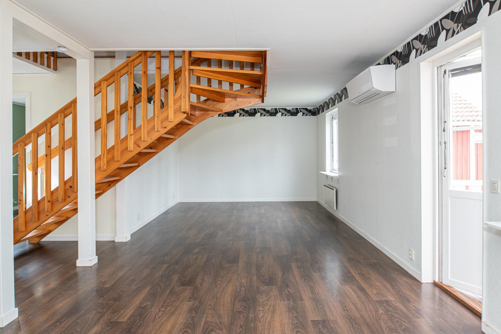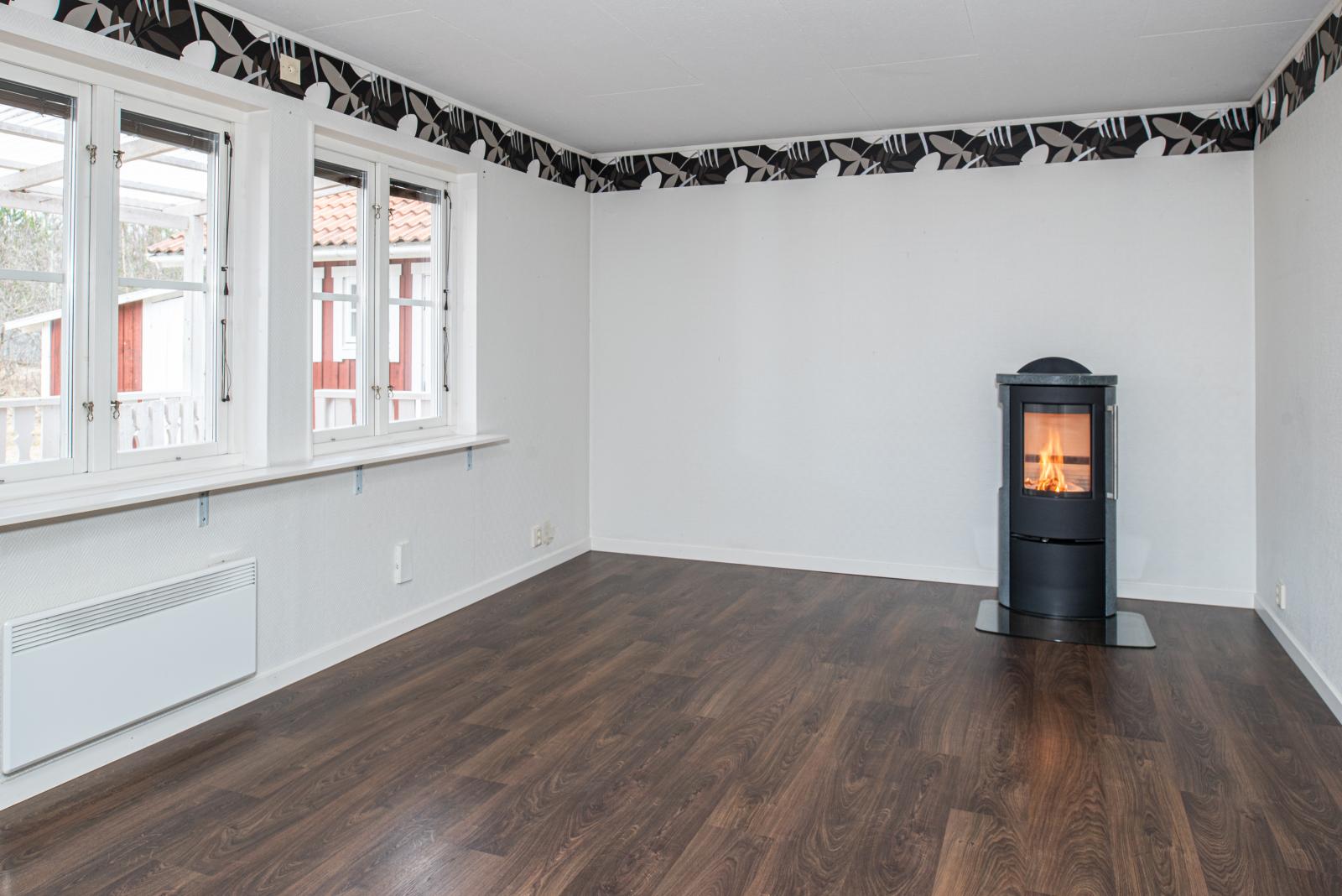 Vardagsrummet löper längs hela baksidan och kan enkelt delas upp i två rum eller som nu när det finns både plats för matsalsbordet och soffgruppen. Det finns även en braskamin i rummet och eftersom även luftvärmepumpen sitter här sprider sig värmen gott i hela huset.  Altandörr ut till altan under tak.
