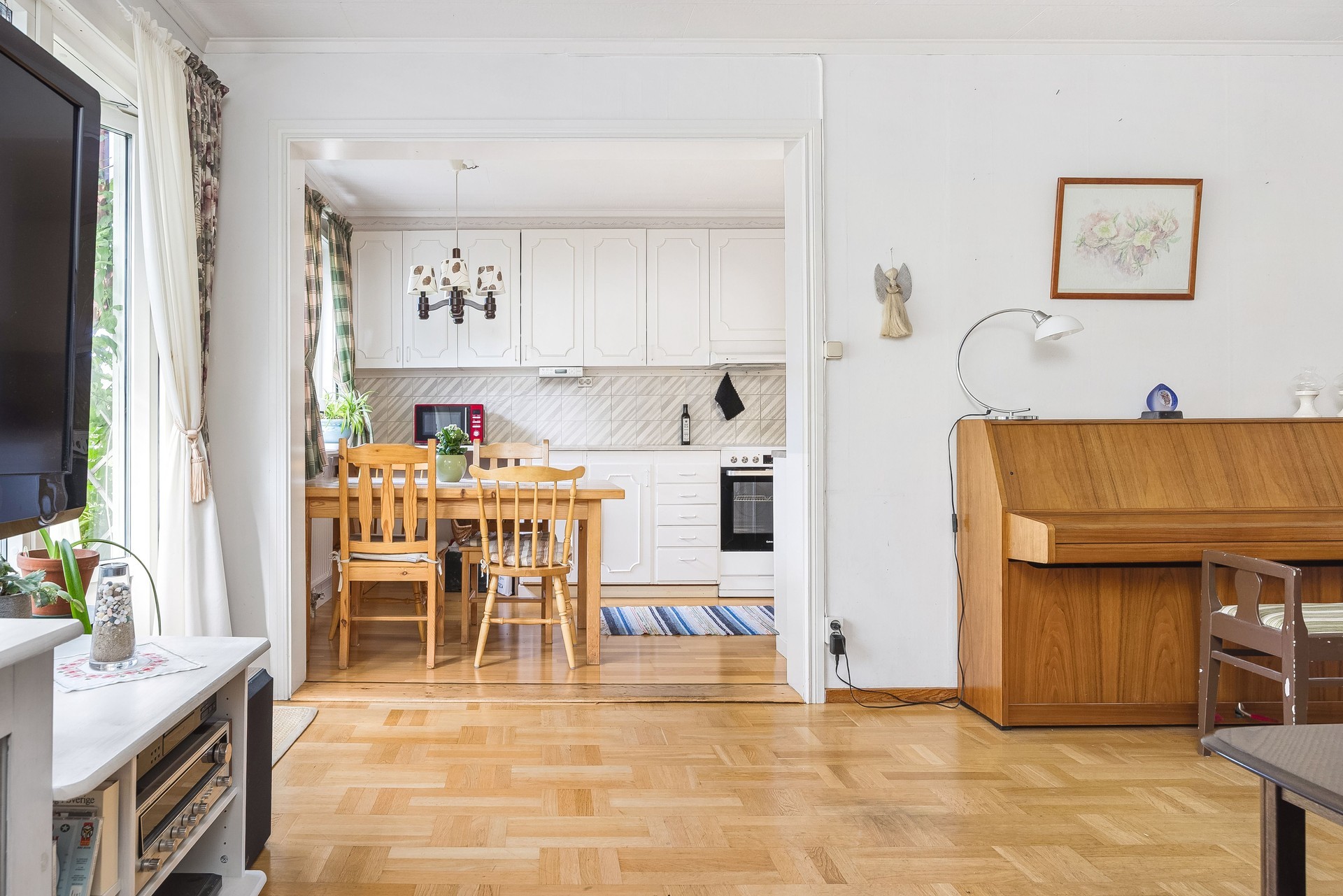 Ljust och rymligt vardagsrum intill bostadens kök med utgång till uteplats som leder dig vidare till trädgård i perfekt solläge.
