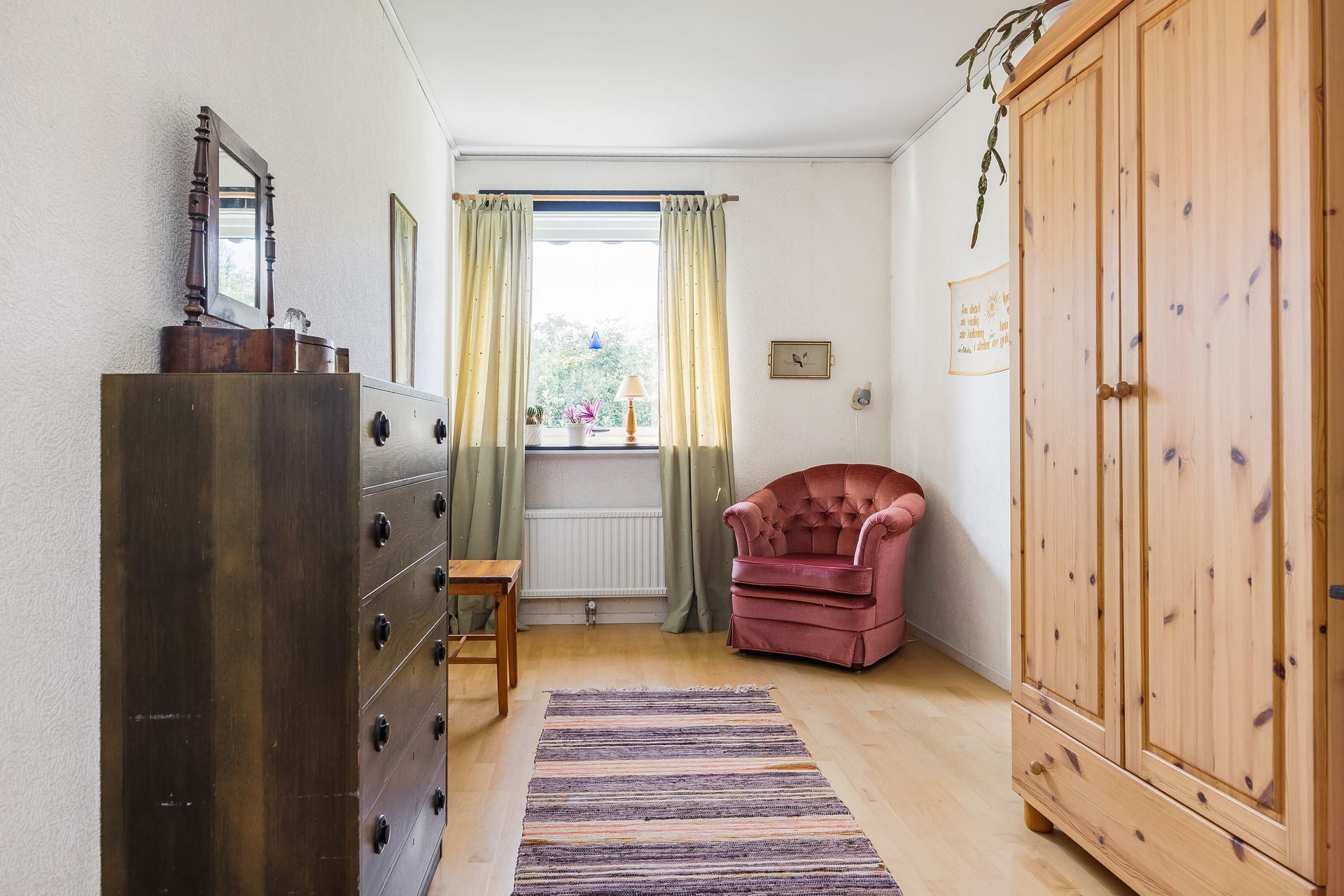 Intill vardagsrummet finns bostadens andra sovrum med fönster mot nordöst.