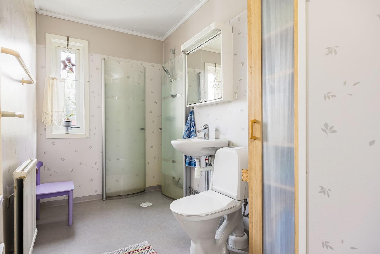 Rymligt badrum (renoverat 2016) som har dusch med infällbara duschdörrar, spegelskåp, handfat, wc samt skåp för förvaring.