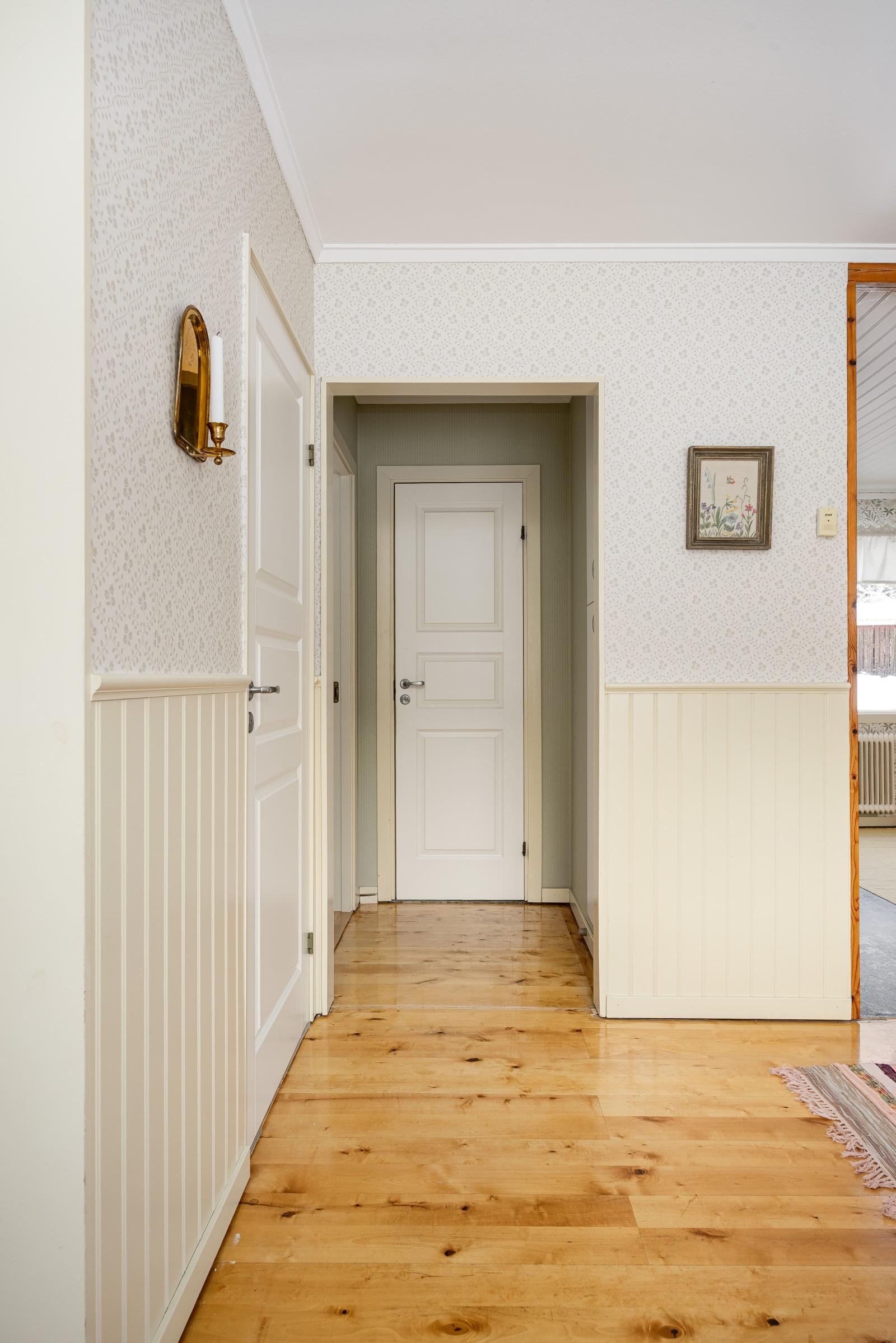 Välkommen in i bostadens hall med en ljus bröstpanel och fin tapet på vägg. Här finns avhängning för kläder.