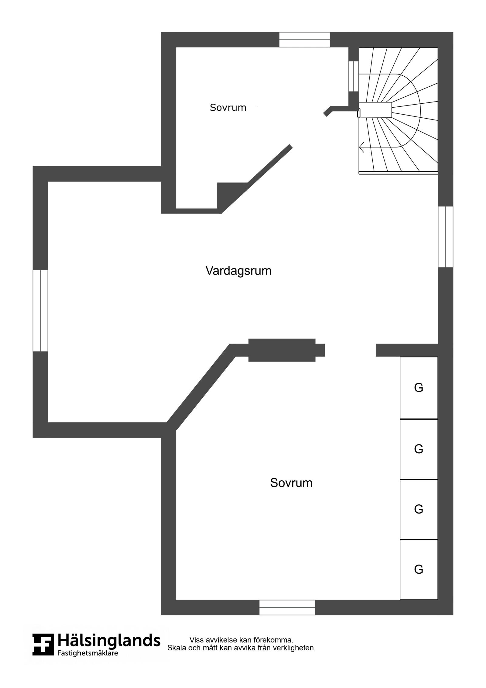 Bostadens andra rymliga sovrum finner du på övre plan. Möblerbart med dubbelsäng, klädförvaringsutrymme finns längs med ena väggen.