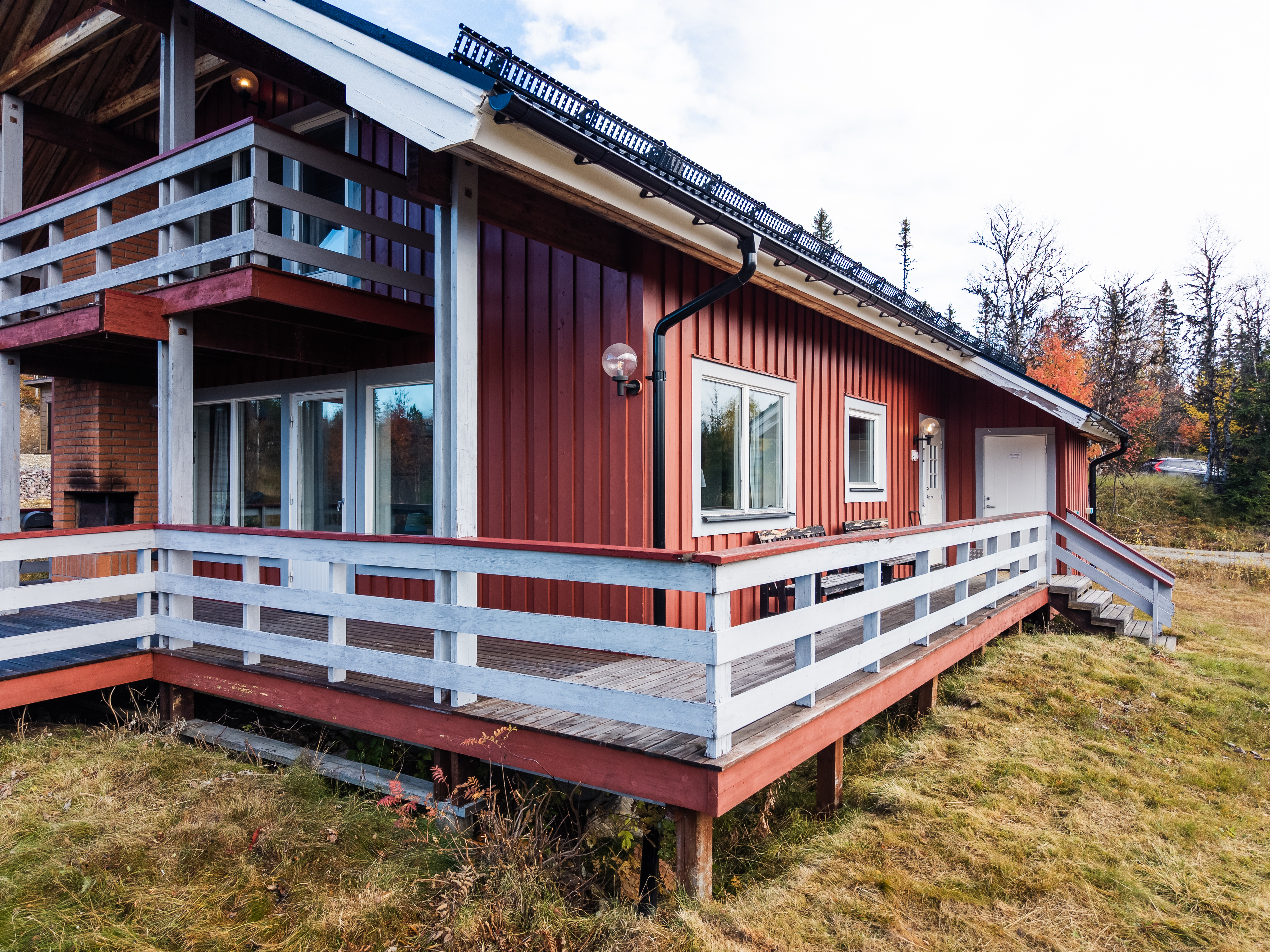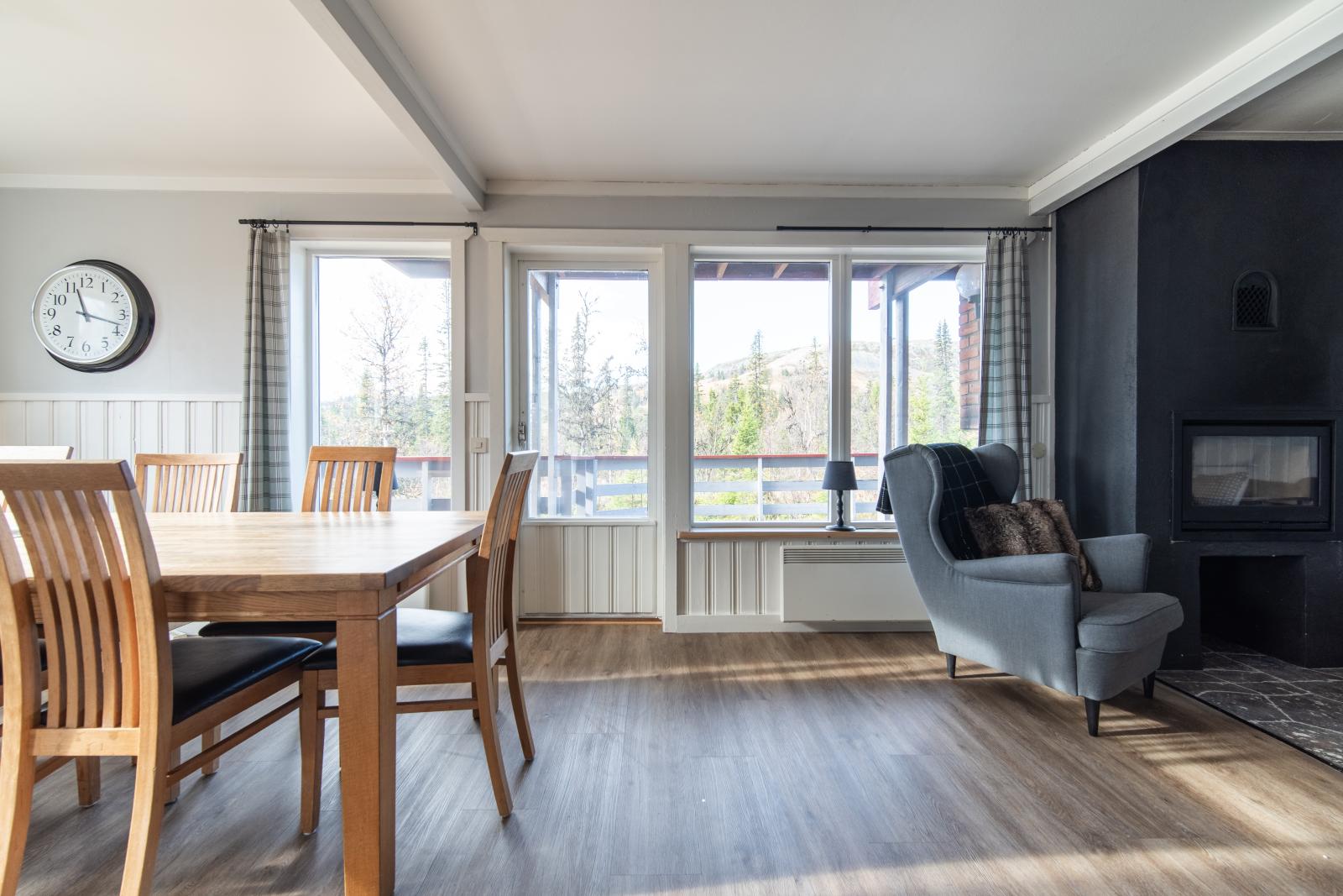 Matplatsen intill ligger i öppen planlösning med allrummet. Där finns en mysig eldstad som skapar en varm och inbjudande atmosfär, perfekt för kalla vinterkvällar. Dessutom finns en generös veranda - även den med eldstad, där du kan njuta av långa sommarkvällar efter vandringen eller värma dig efter en dag i skidbackarna.