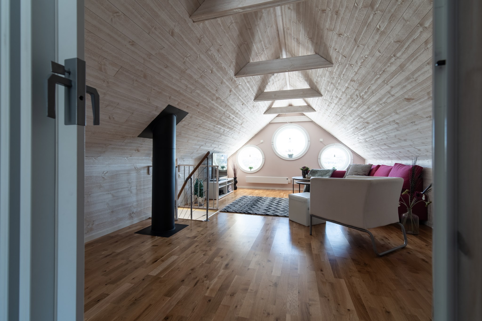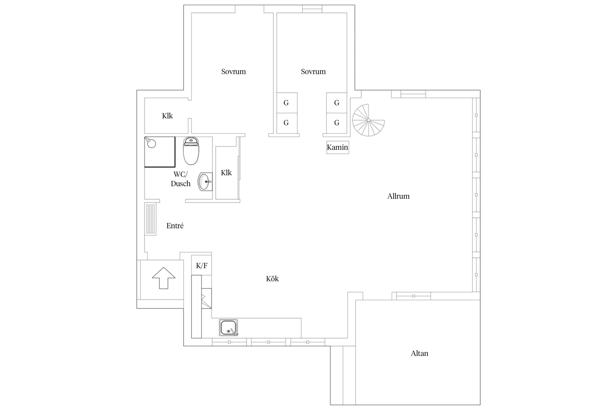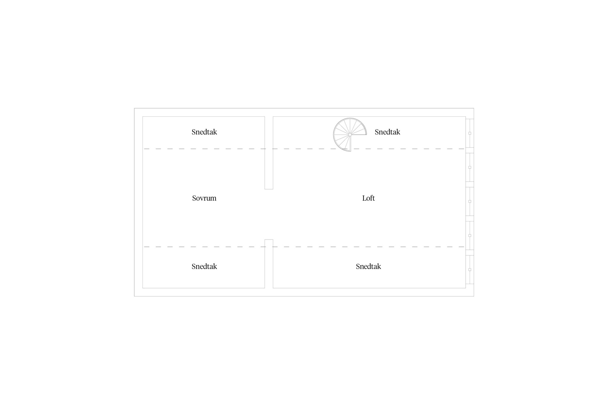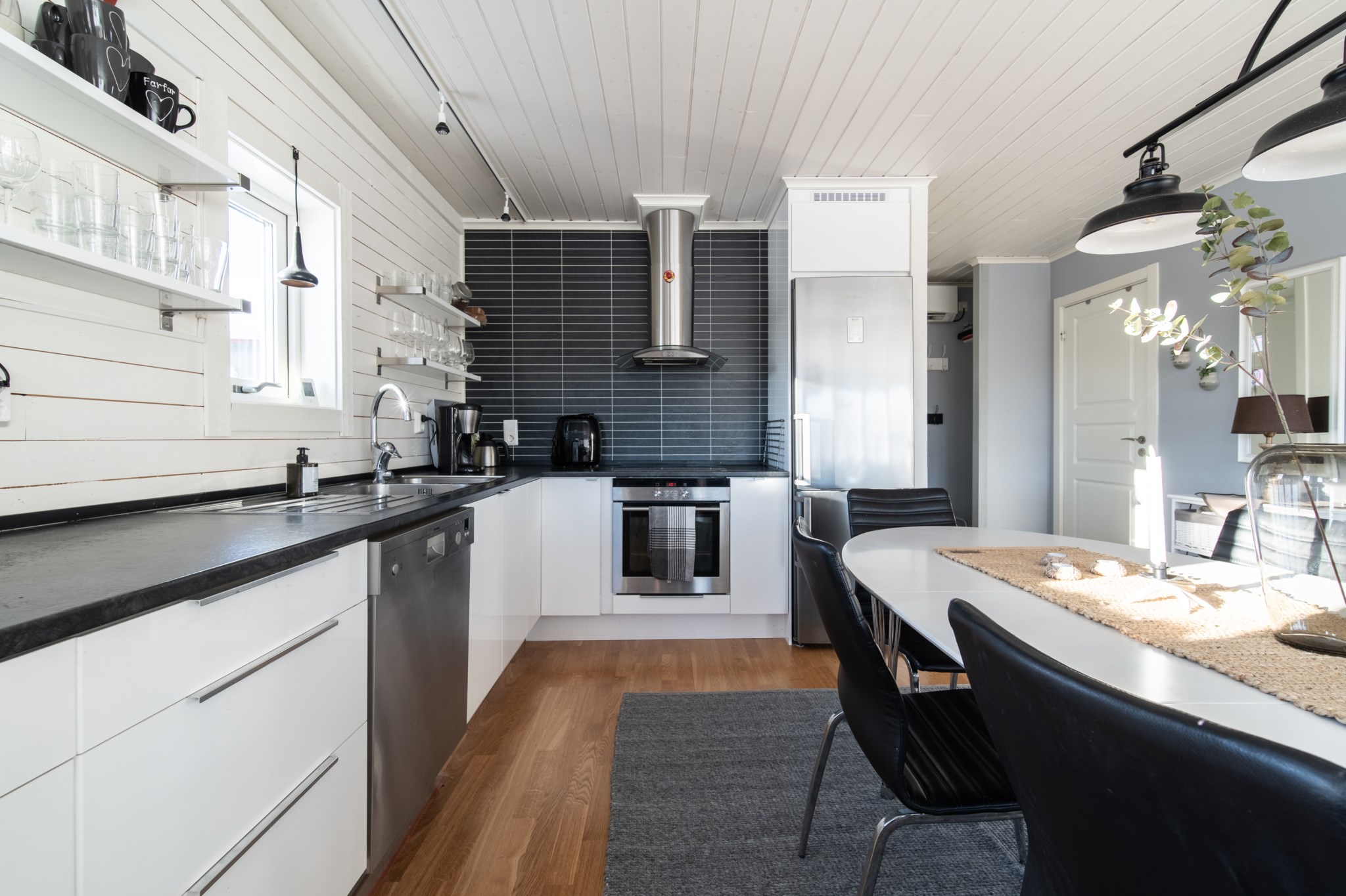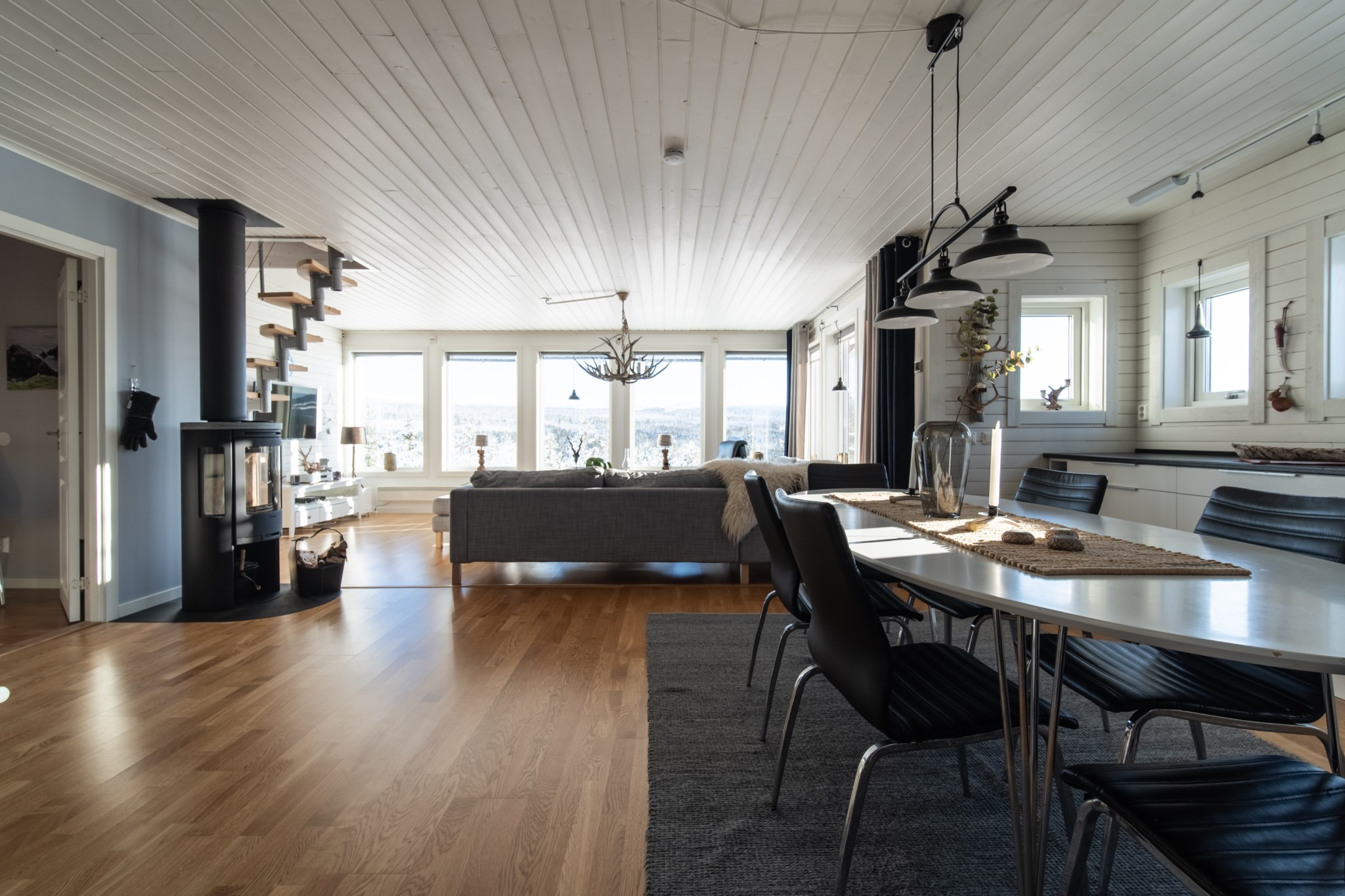 Bostaden erbjuder en social och öppen planlösning där kök, vardagsrum och matplats tillsammans med kaminen blir den självklara platsen för umgänge. Här finns också två sovrum, badrum och en utgång till altanen. Utanför huset finns en gedigen gårdsplan ett uthus med bastu, relax och förvaring samt ett skoterförråd, På tomten står också en grillplats med magisk utsikt.