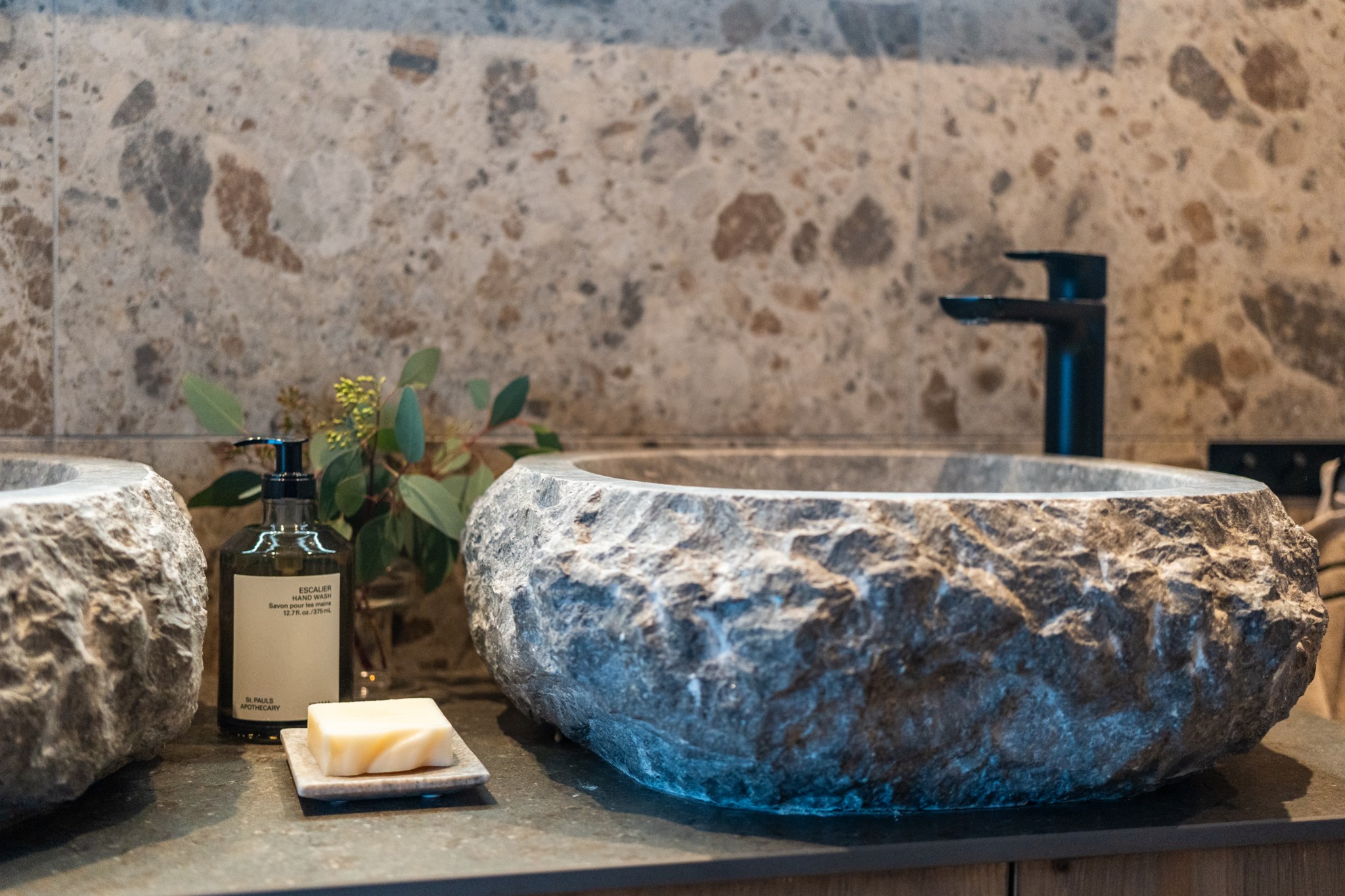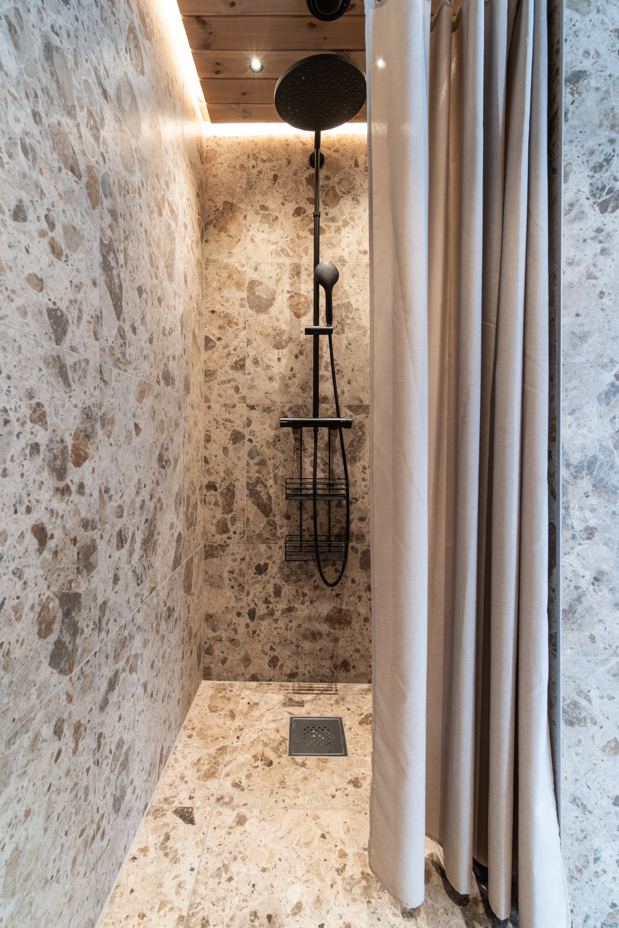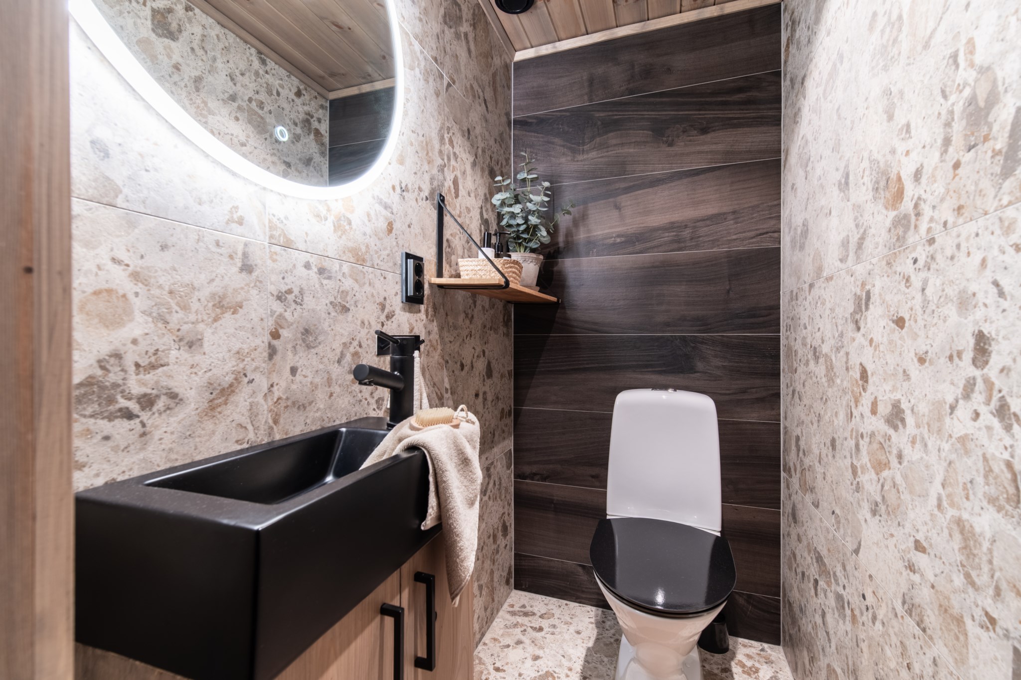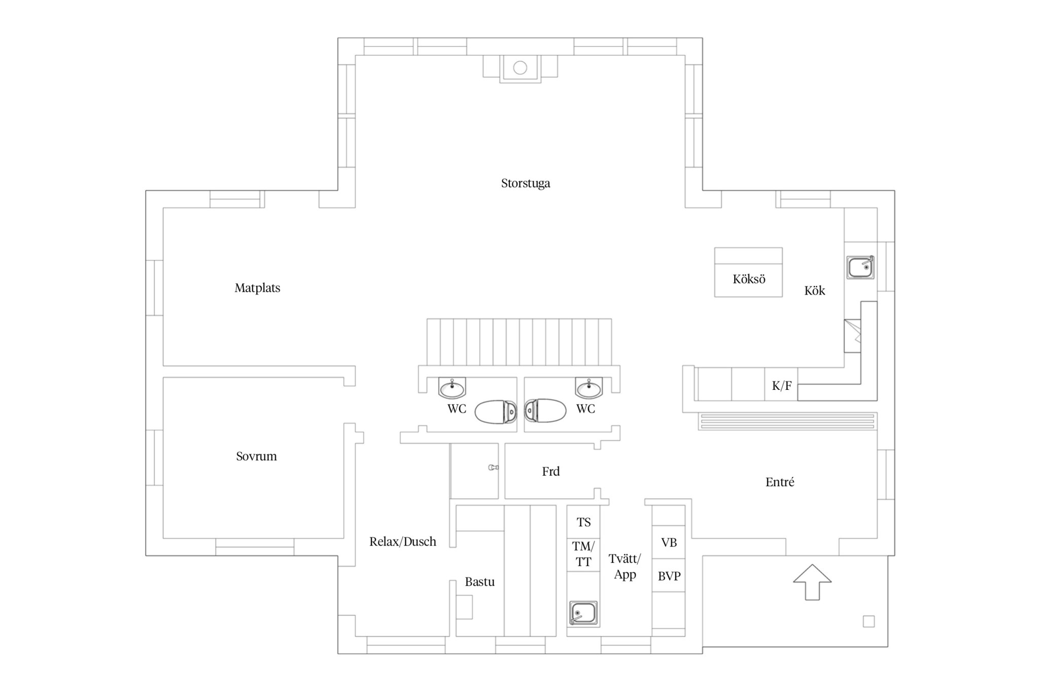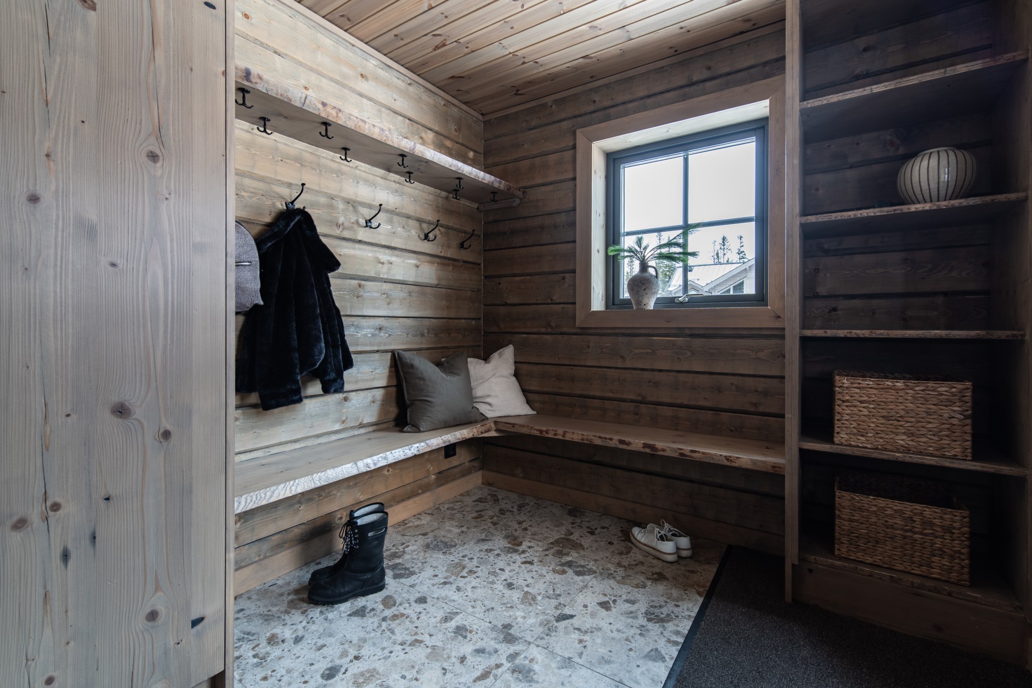 I husets relaxavdelning väntar en bastu i värmebehandlad asp, nedpendlat tak med integrerad belysning som ger en härlig atmosfär efter en frisk dag på fjället. Den genomtänkta skidåkarentrén med platsbyggd inredning gör livet enkelt för den aktiva familjen, då den ger gott om plats för många gäster.