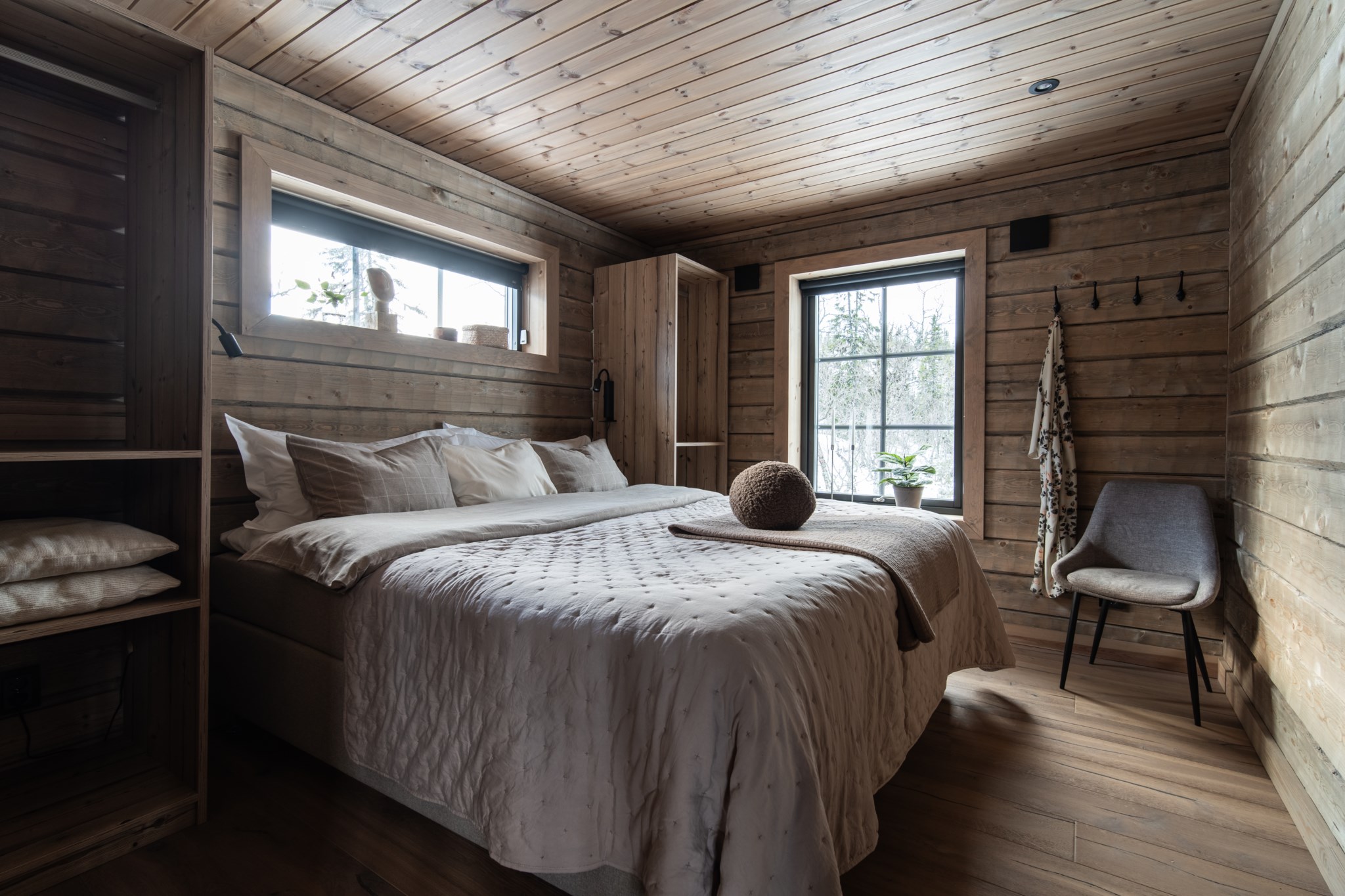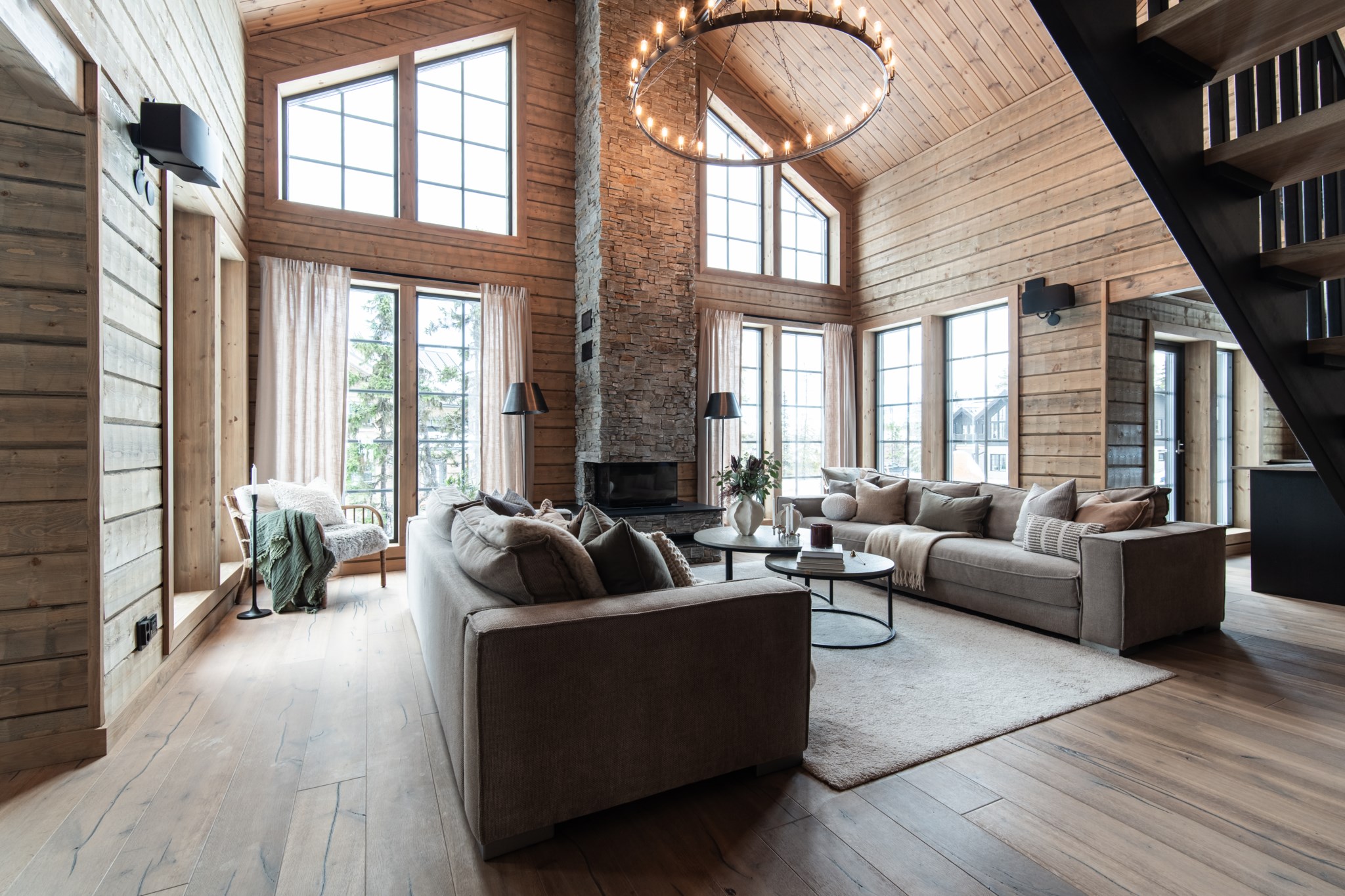 De generösa fönsterpartierna ramar in naturen och fjället och släpper in ljuset vilket förstärker den öppna och sociala planlösningen. Det är vattenburen golvvärme i båda planen vilket ger komfort året om, medan den stensatta öppna spisen blir hemmets naturliga samlingspunkt. Köket är en dröm för finsmakaren – med köksö, vinkyl och stilrena lösningar som bjuder in till sociala stunder.