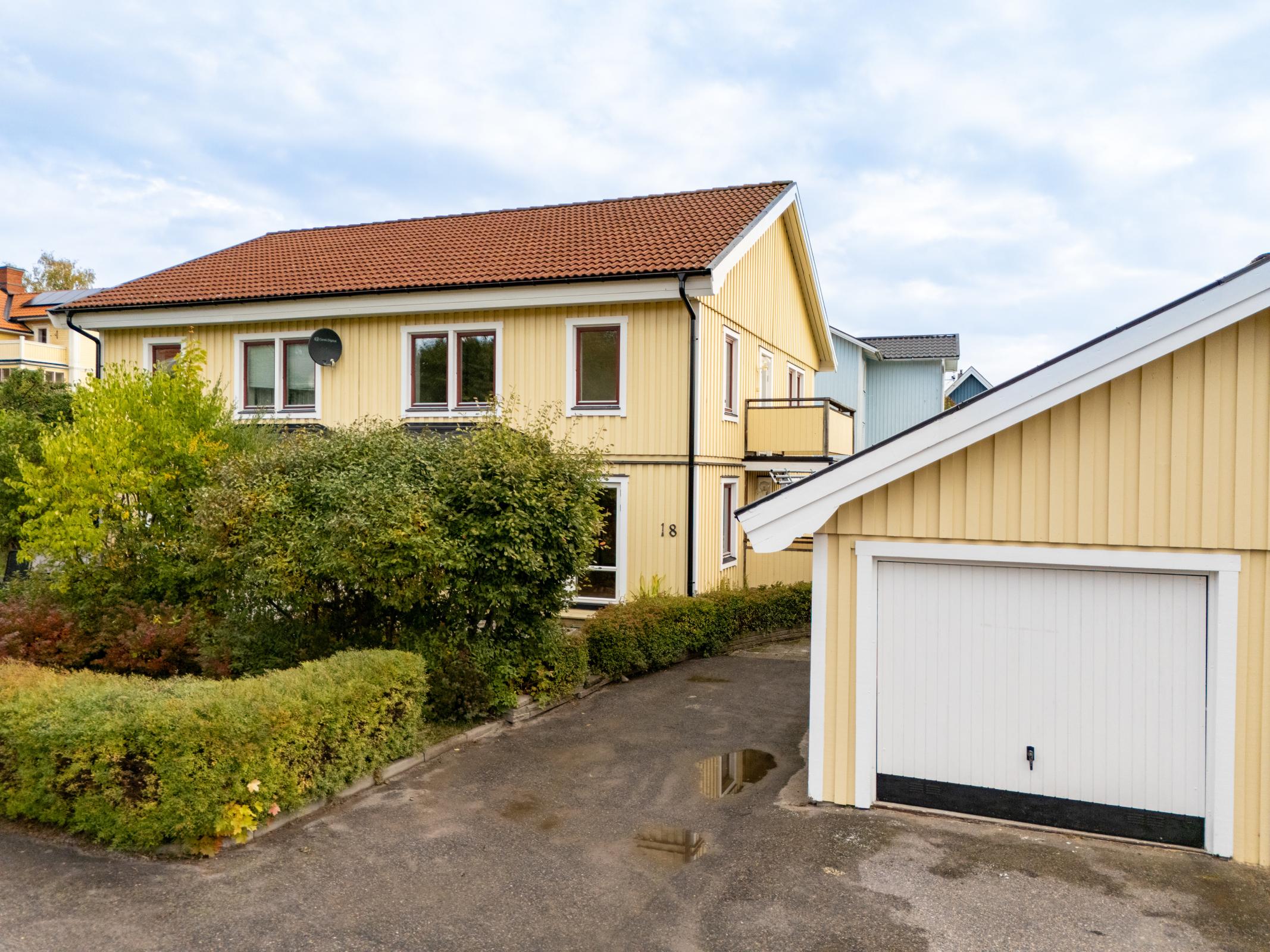 En asfalterad uppfart finns vid bostaden garage där du kan parkera din bil på uppfarten eller bekvämt i garaget under vintertid. I anslutning till garaget finns också ett förråd. Garaget har betongonplatta och är ihop byggt med grannens garage.