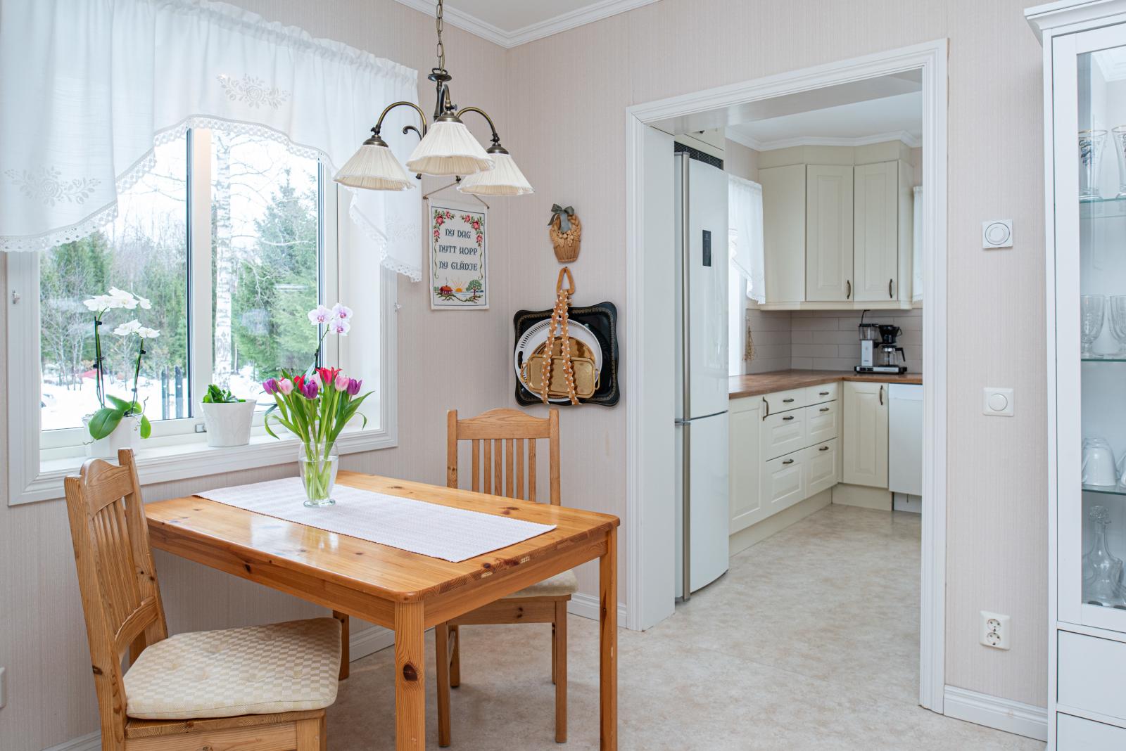 Hallen har förvaring för ytterkläder bakom spegelglas med skjutdörrar. Vidare in finner vi köket som även det byggdes om 2011 - med matplats och bänkytor för förberedning. Allrummet har en öppen spis med insats och utgång till det glasade uterummet som rymmer hela 40 kvm. Det här är ett rum som används året om, här finns golvvärme och energisnåla isolerglasrutor, och allt i övrigt är isolerat. Här ges en magisk utsikt ner över marken, mot sjön och de vackra blånande bergen.
